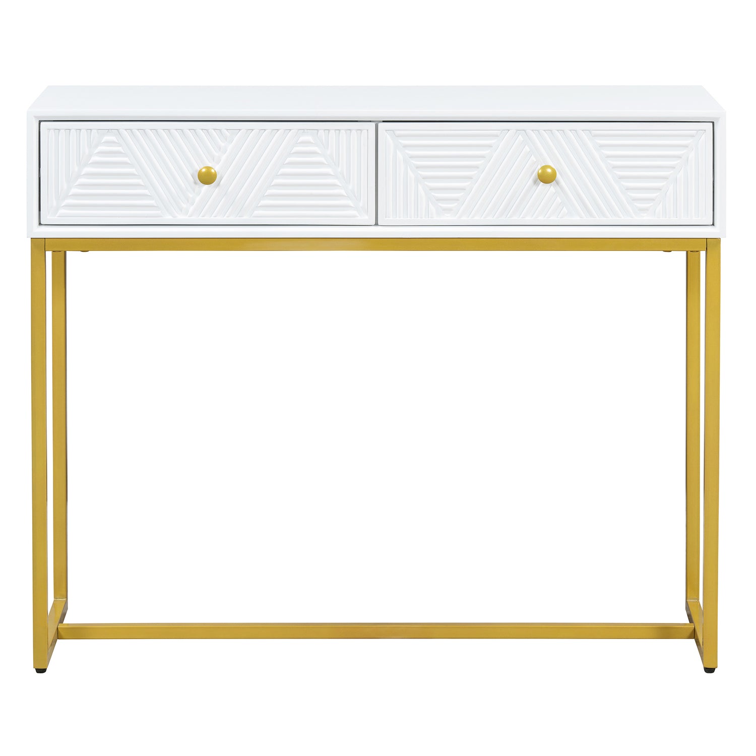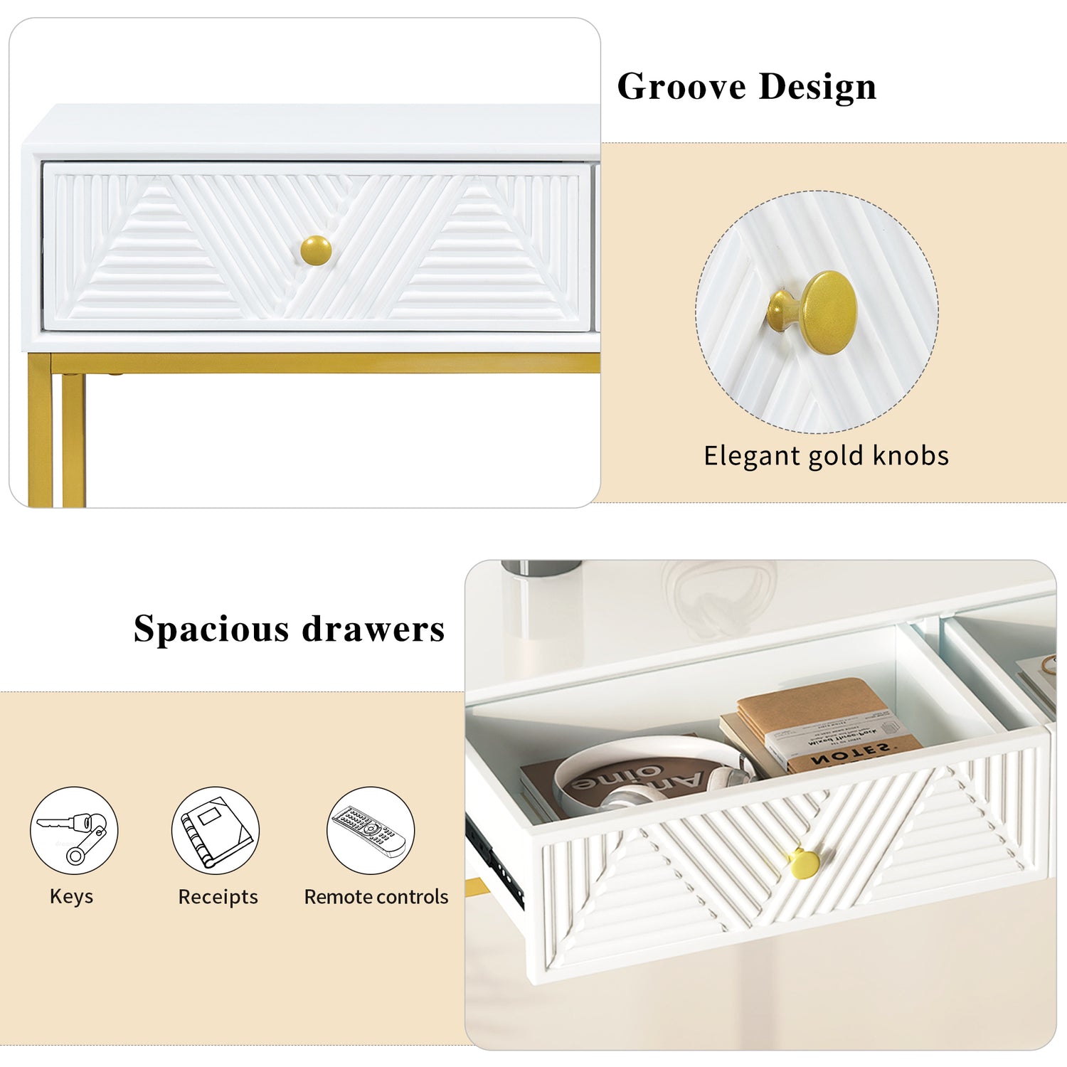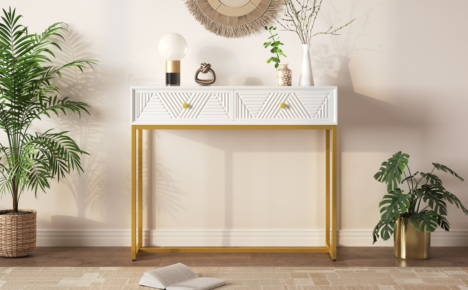 - Unique Drawer Front Design: The two drawers showcase a meticulously crafted diagonal stripe pattern, adding depth, texture, and a refined sense of artistry to the piece. The geometric precision of the design reflects a high level of craftsmanship, ensuring that every detail contributes to its visual appeal. Complemented by elegant gold knobs, the drawer fronts exude a subtle yet luxurious charm, elevating the Console Table with Storage’s overall design.