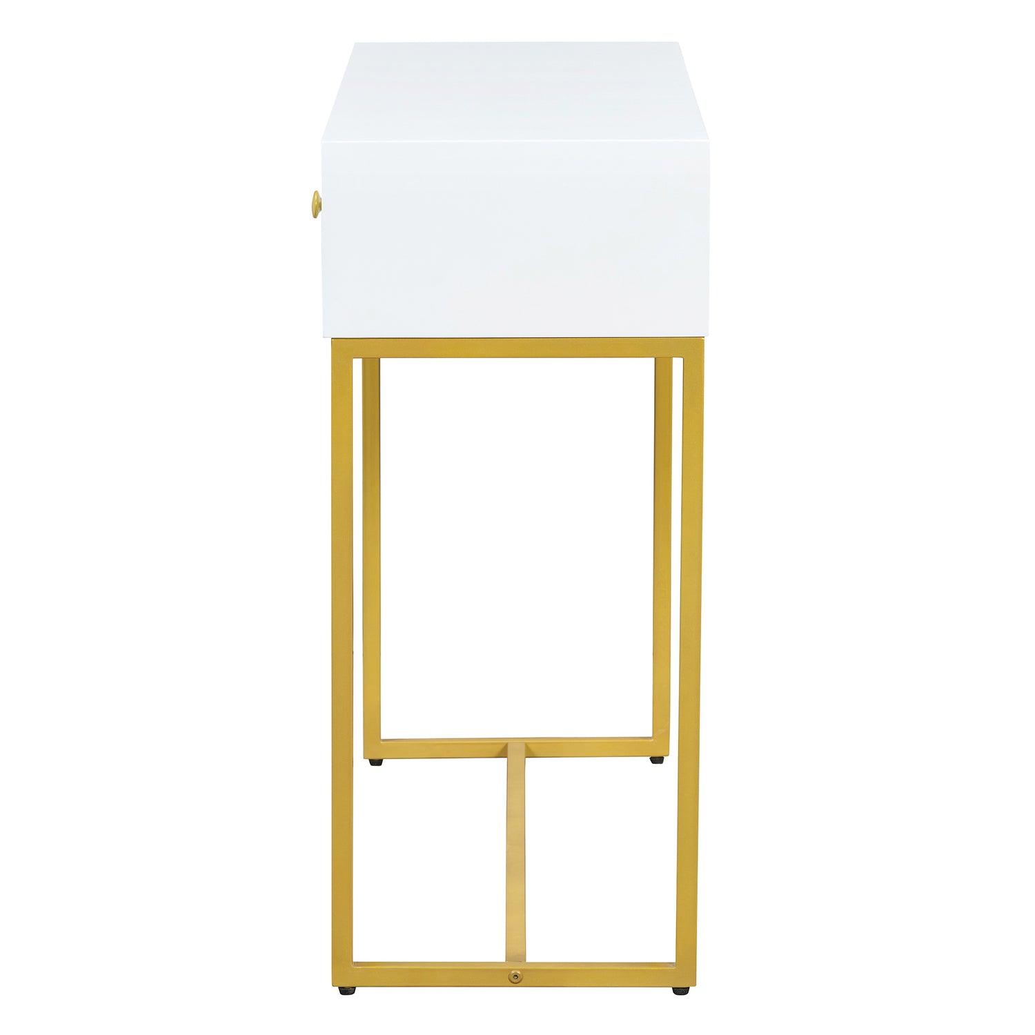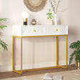 - Durable MDF Construction: Built from high-quality MDF, this Entryway Table offers exceptional durability and a smooth, polished surface that enhances its modern appeal. The sturdy build ensures long-lasting use, with the tabletop supporting up to 110 lbs. Additionally, the gold metal legs are equipped with adjustable foot pads, ensuring stability on uneven surfaces while adding functionality to its sleek design.