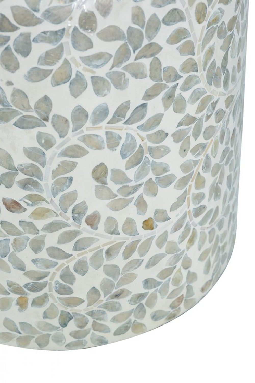 - Breathing fresh life into the classic cylindrical table, this piece is adorned with an elegant white capiz shell pattern, creating a display reminiscent of refined mosaic.