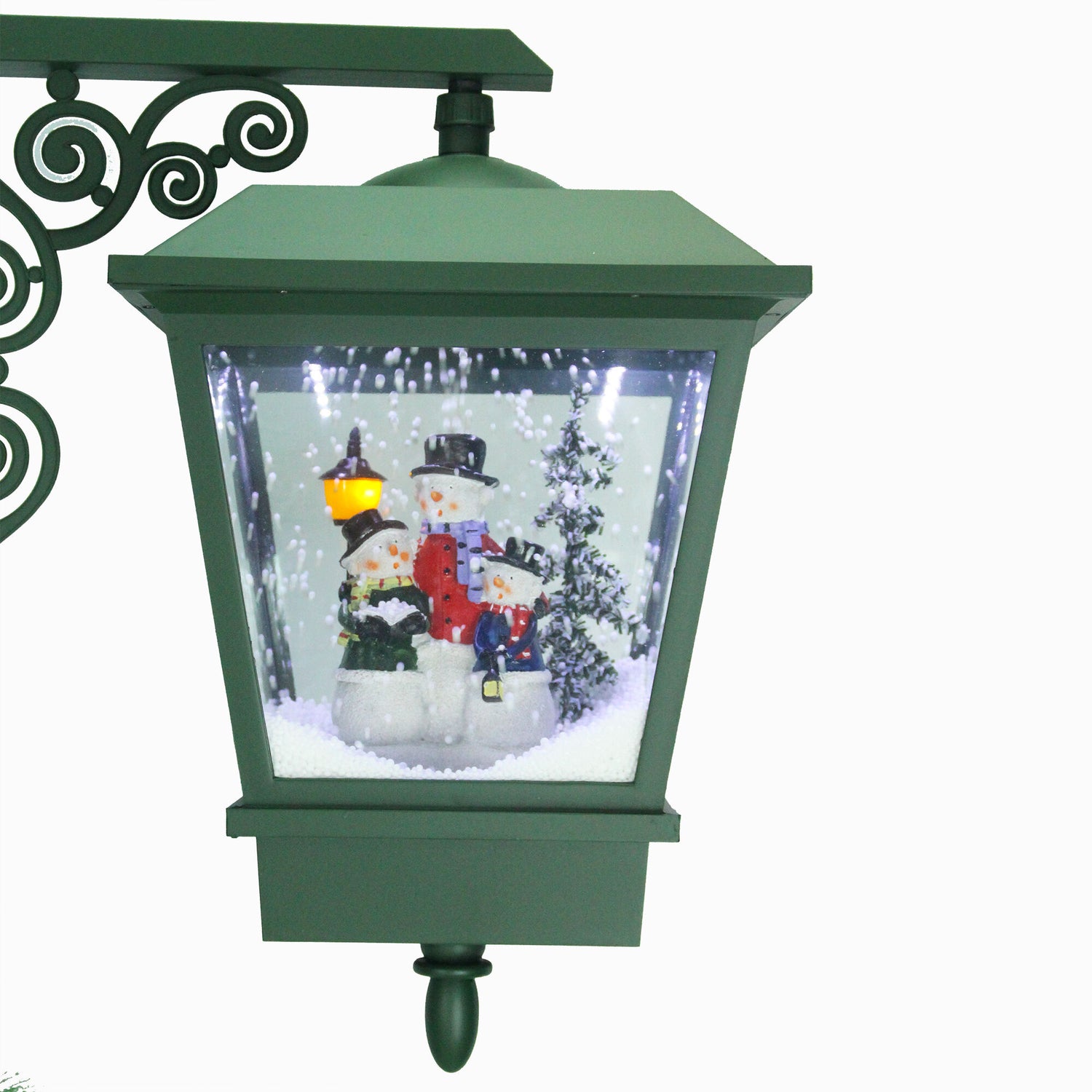Light the night with a 74-inch Dual-Lantern Musical Snowy Street Lamp from Christmas Time. Our snowy lamps produce flurries of faux snow that fall over various holiday scenes. This amazing holiday lamp post features two musical snow lanterns - one with a traditional Santa scene and one with a delightful snowman scene. Snow dances playfully over each scene while your favorite Christmas Carols play, including 25 family favorites such as Jolly Old Saint Nicholas, The Twelve Days of Christmas, Joy to the World, and many more. Embellished with traditional scrollwork, a festive sign, a berry-covered wreath, and a classic red bow, this unique holiday street lamp will create a magical winter wonderland on your porch, walkway, driveway, or anywhere else in your yard. Simply plug it in and let it snow, let it snow, let it snow!