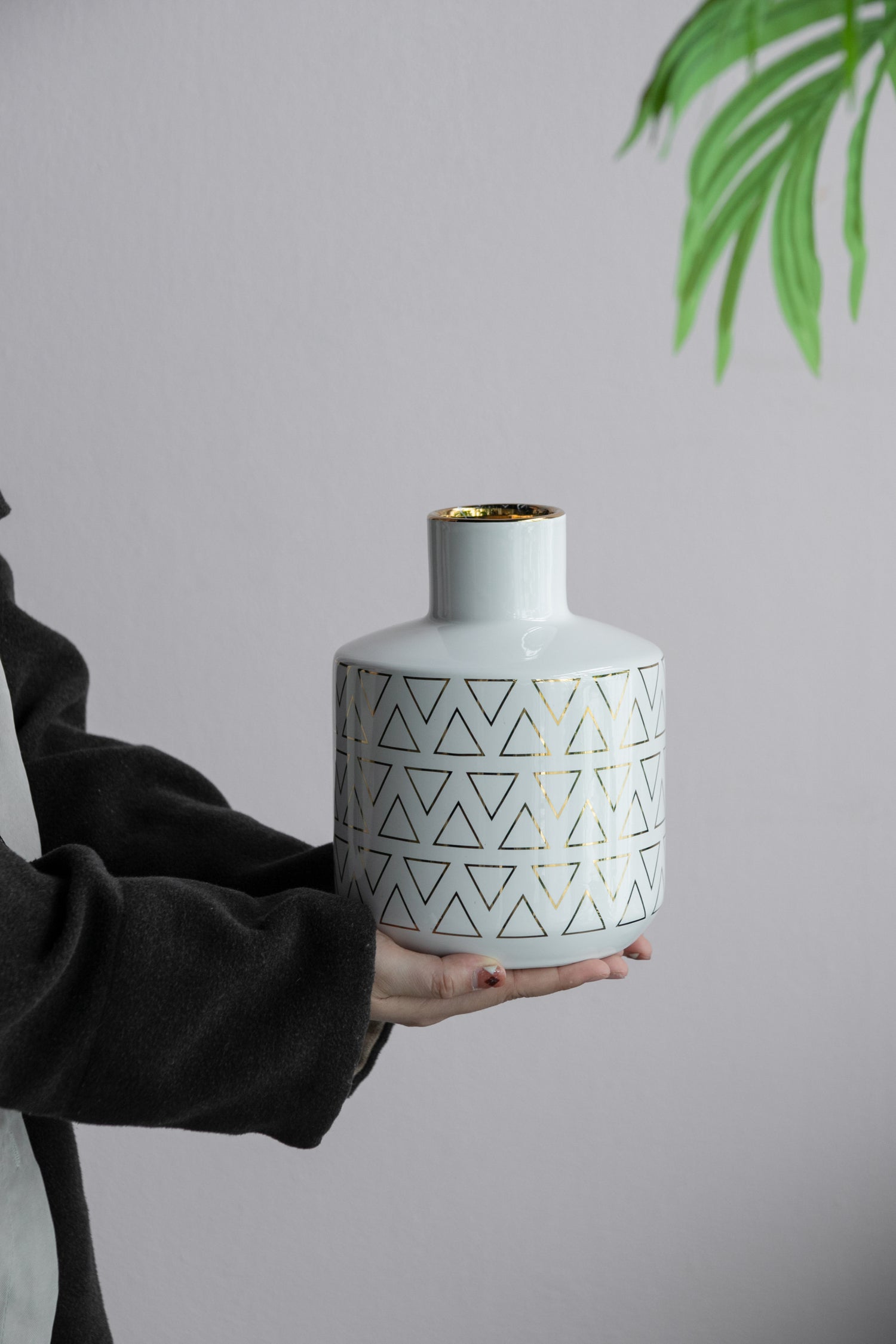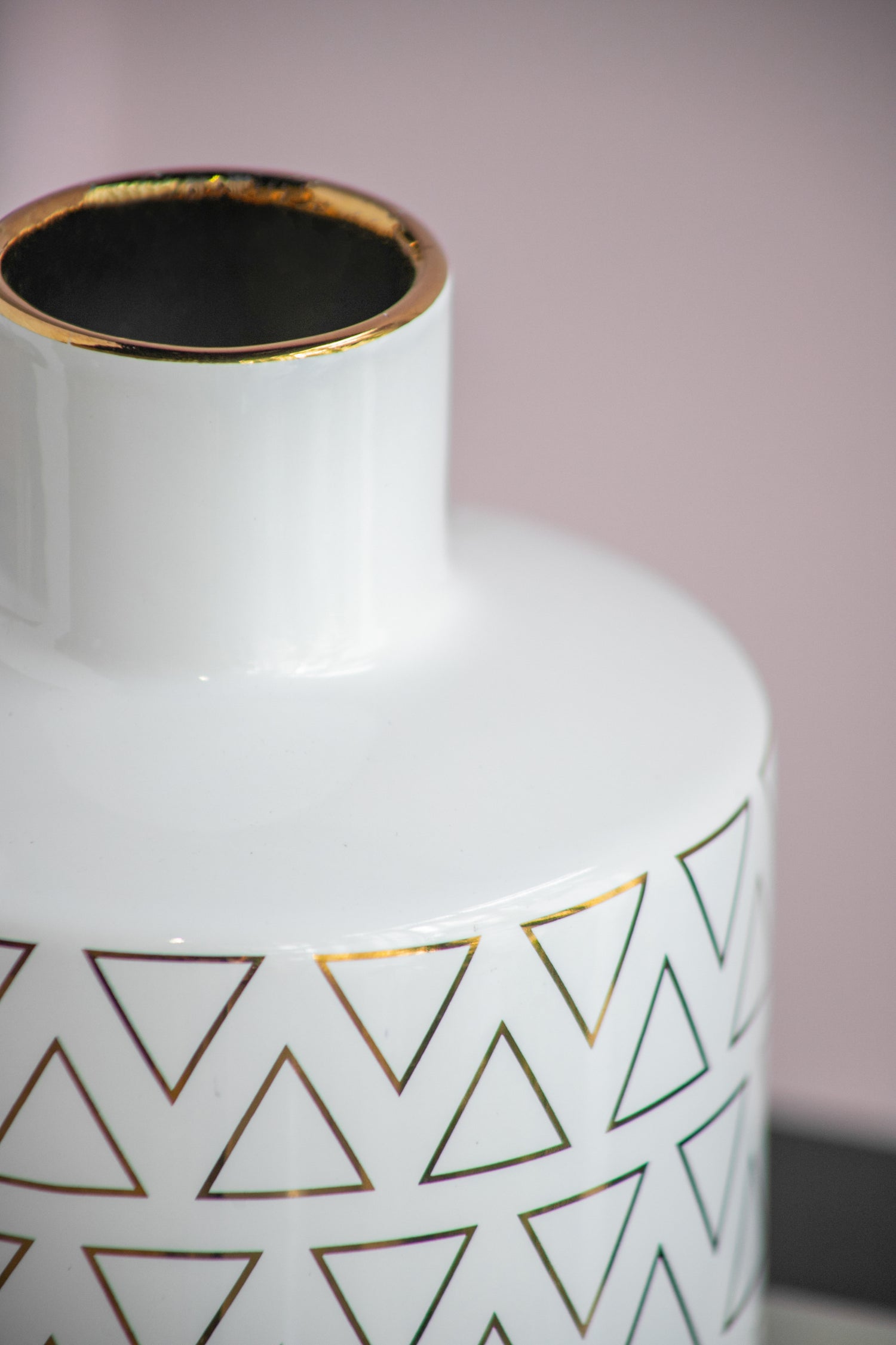 - Made of ceramic with a gloss white finish and gold trim, this modern vase showcases a geometric triangle pattern.