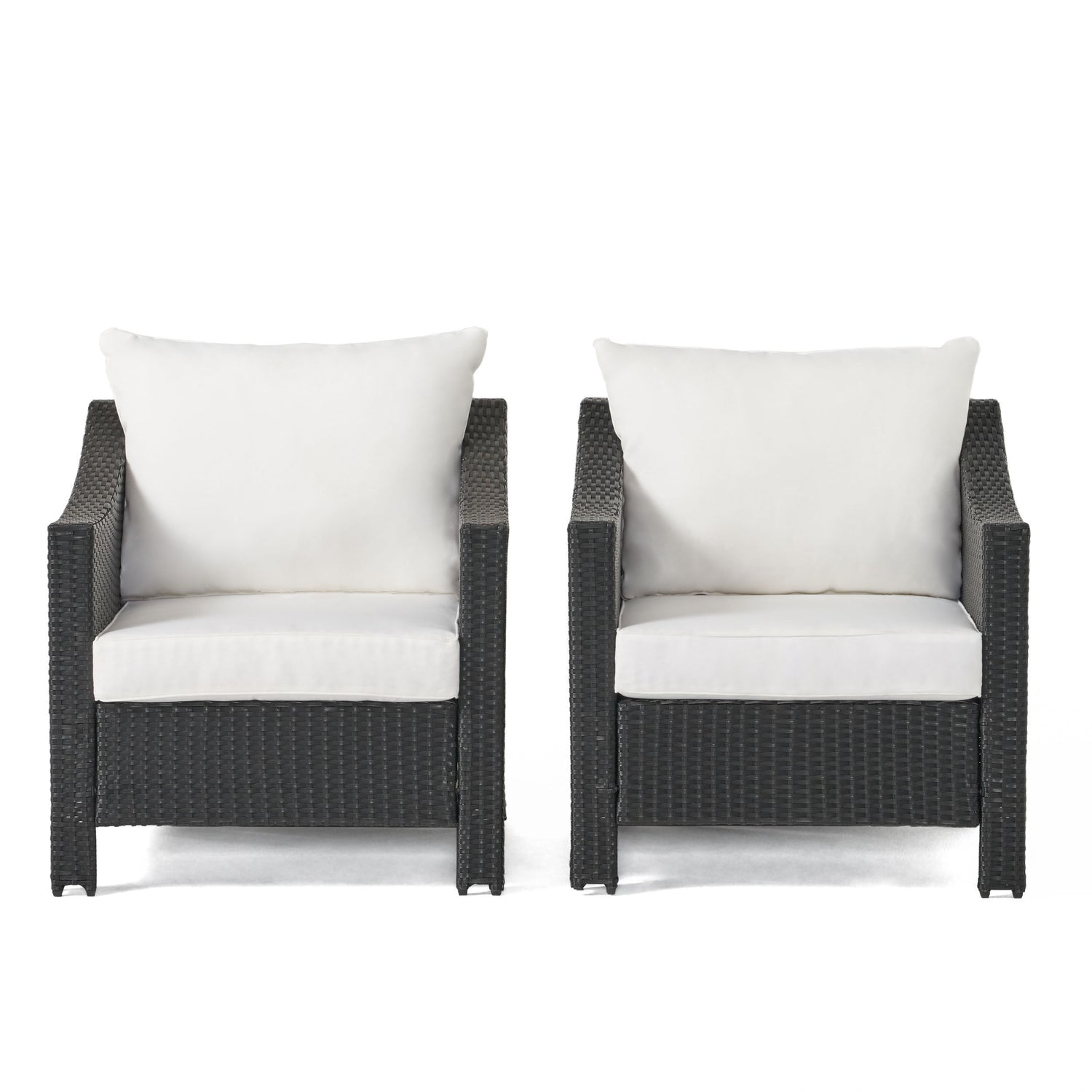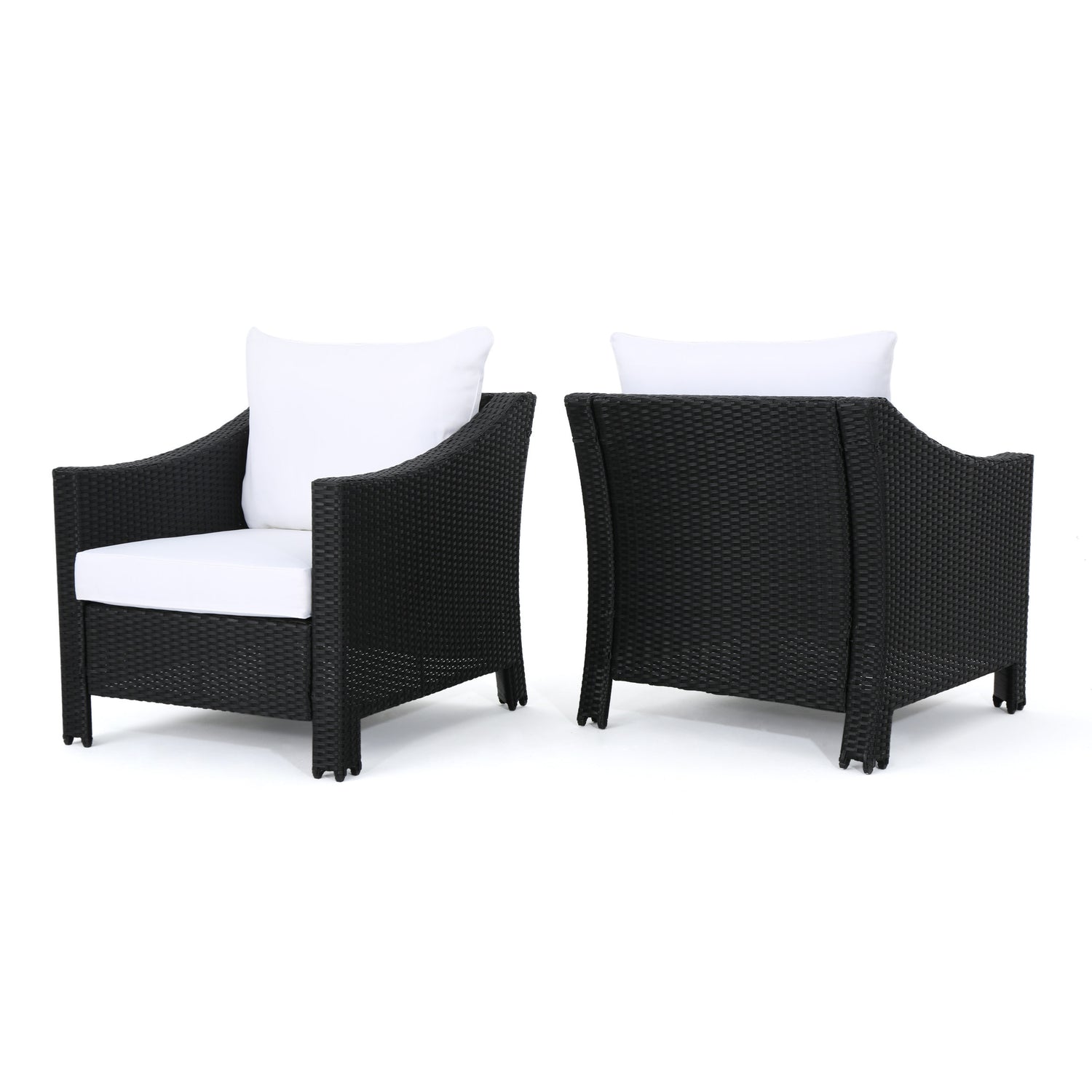 - These wicker club chairs are a great addition to any patio. The water resistant cushions make both the chair and the cushions ideal for an outdoor setting (good to stay out all summer long.) The slight curve of the arms adds the perfect amount of flair, giving you a stylish and comfortable set of club chairs for your patio.