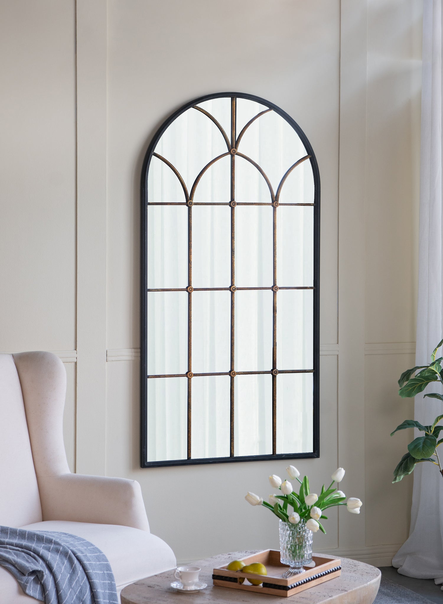 Featuring a grand, arched silhouette, a blend of sleek black and warm gold tones, and an elegant windowpane design, this decorative mirror will elevate any space. The simple, timeless style makes it a perfect focal point for any living room, entryway, or bedroom, capturing your full reflection while effortlessly complementing any interior theme.