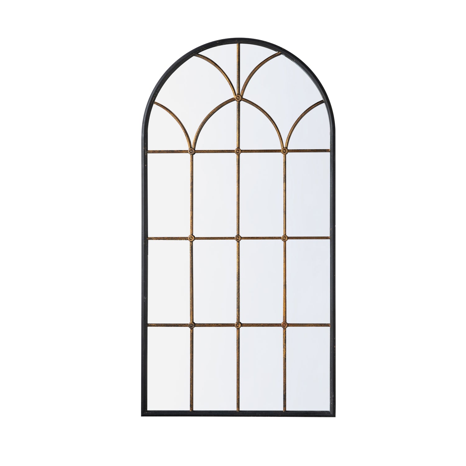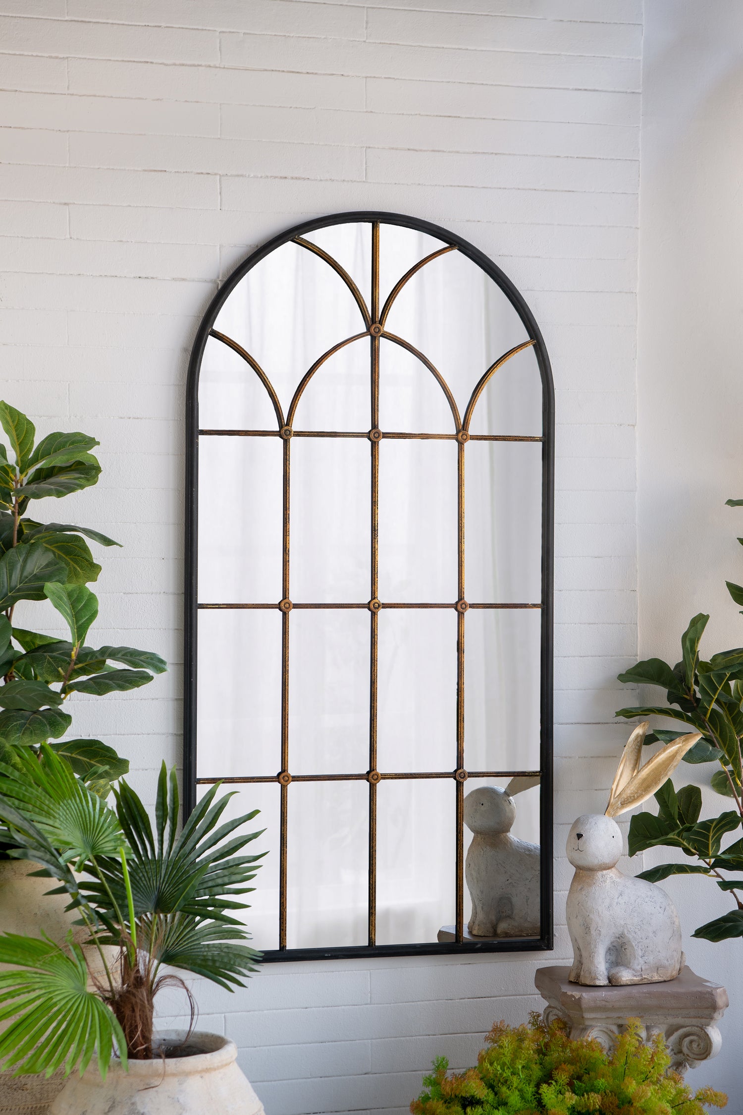 - Featuring a grand, arched silhouette, a blend of sleek black and warm gold tones, and an elegant windowpane design, this decorative mirror will elevate any space.