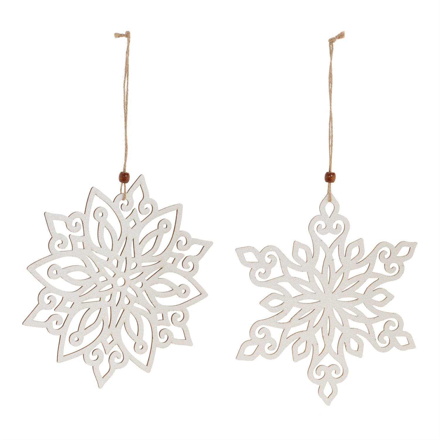 Adorn your Christmas tree with this stunning set of Wood Snowflake Ornaments. Featuring 24 pieces and two assorted designs, the wintry white and beige tones paired with the traditional glittered snowflake design and woodland bead accents are the perfect combination to create a memorable display. The quality solid wood composition with delicate jute string hanger is sure to endure for seasons to come. Whether you're adding a touch of cheer to your home or gifting to a loved one, these ornaments will definitely bring holiday spirit to your home.