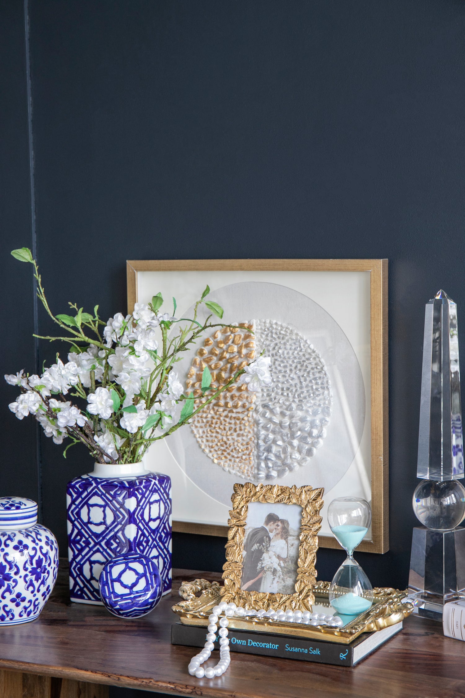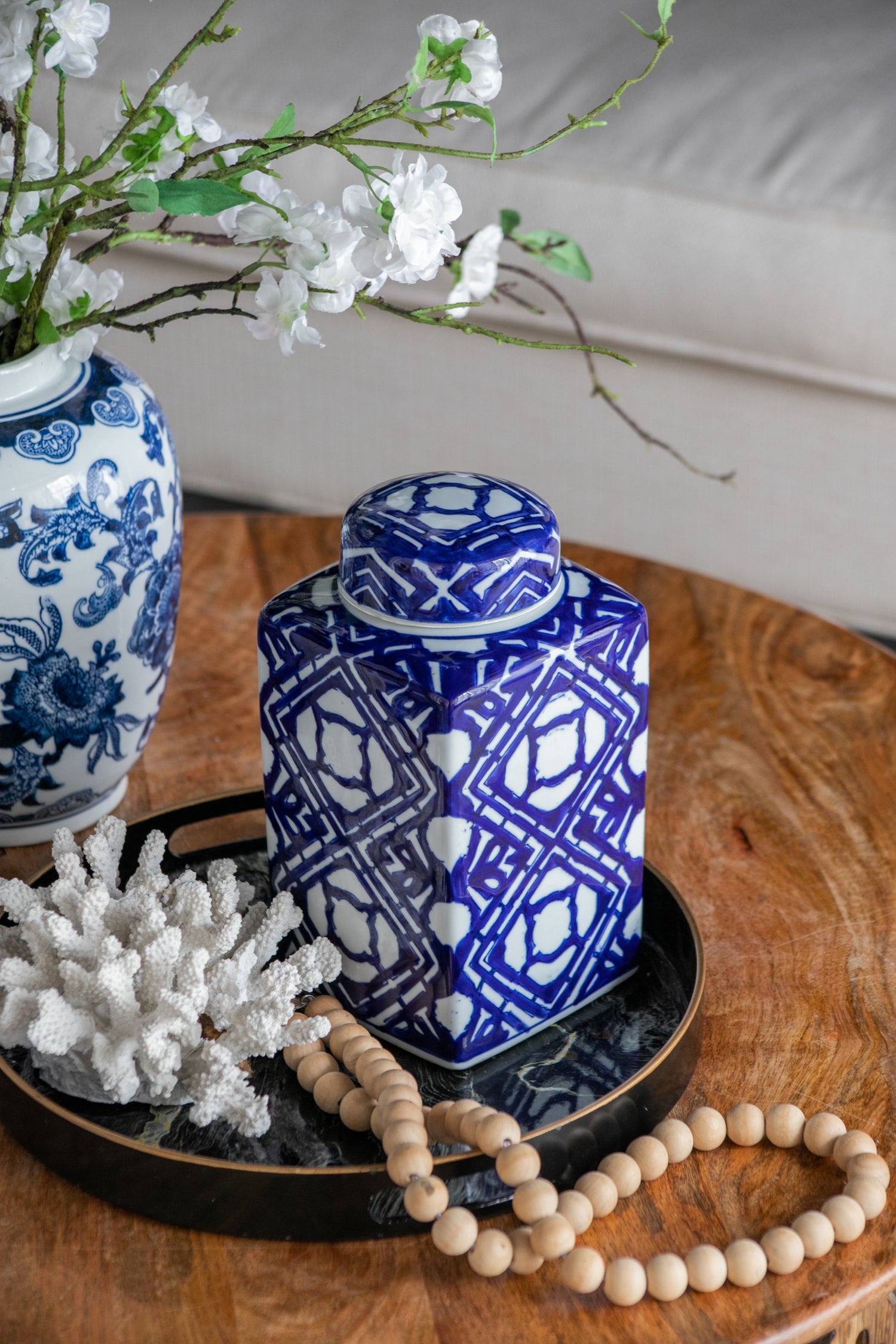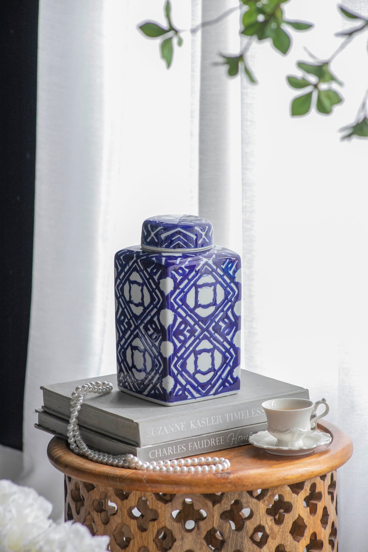 - The bold two-toned colorway and repeating motifs allow this jar to complement transitional, Chinoiserie, eclectic, and contemporary themes, ensuring it can fit into any setting seamlessly