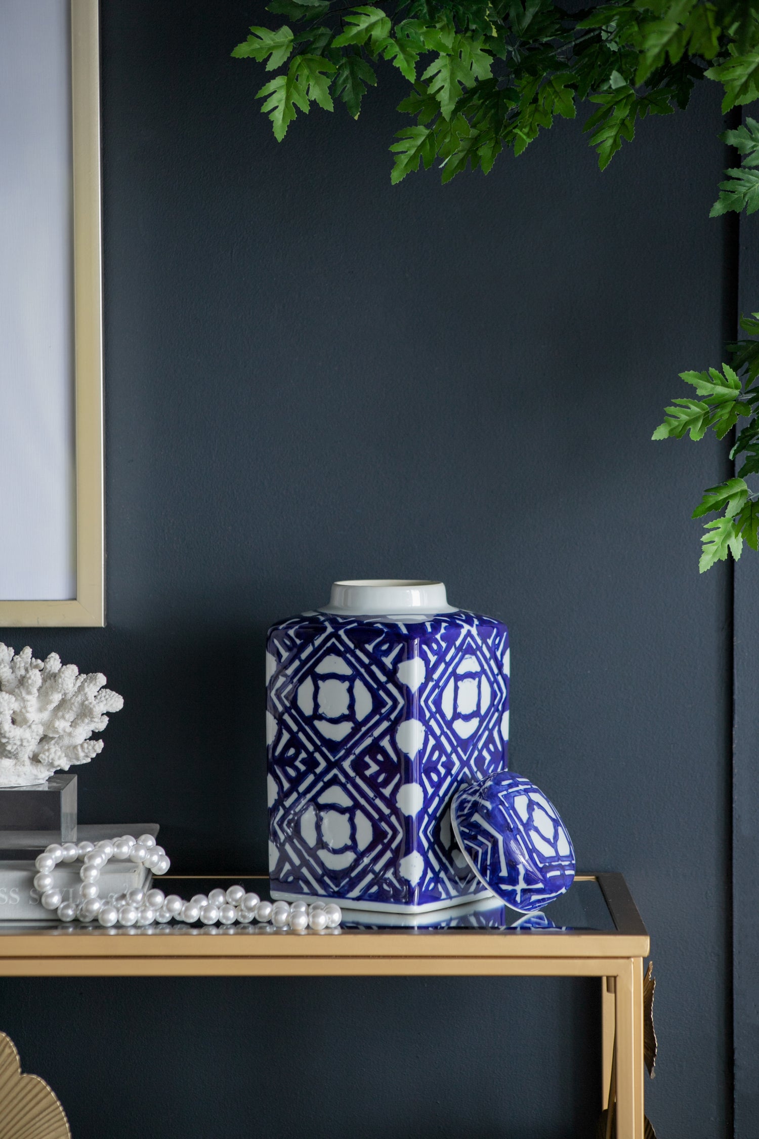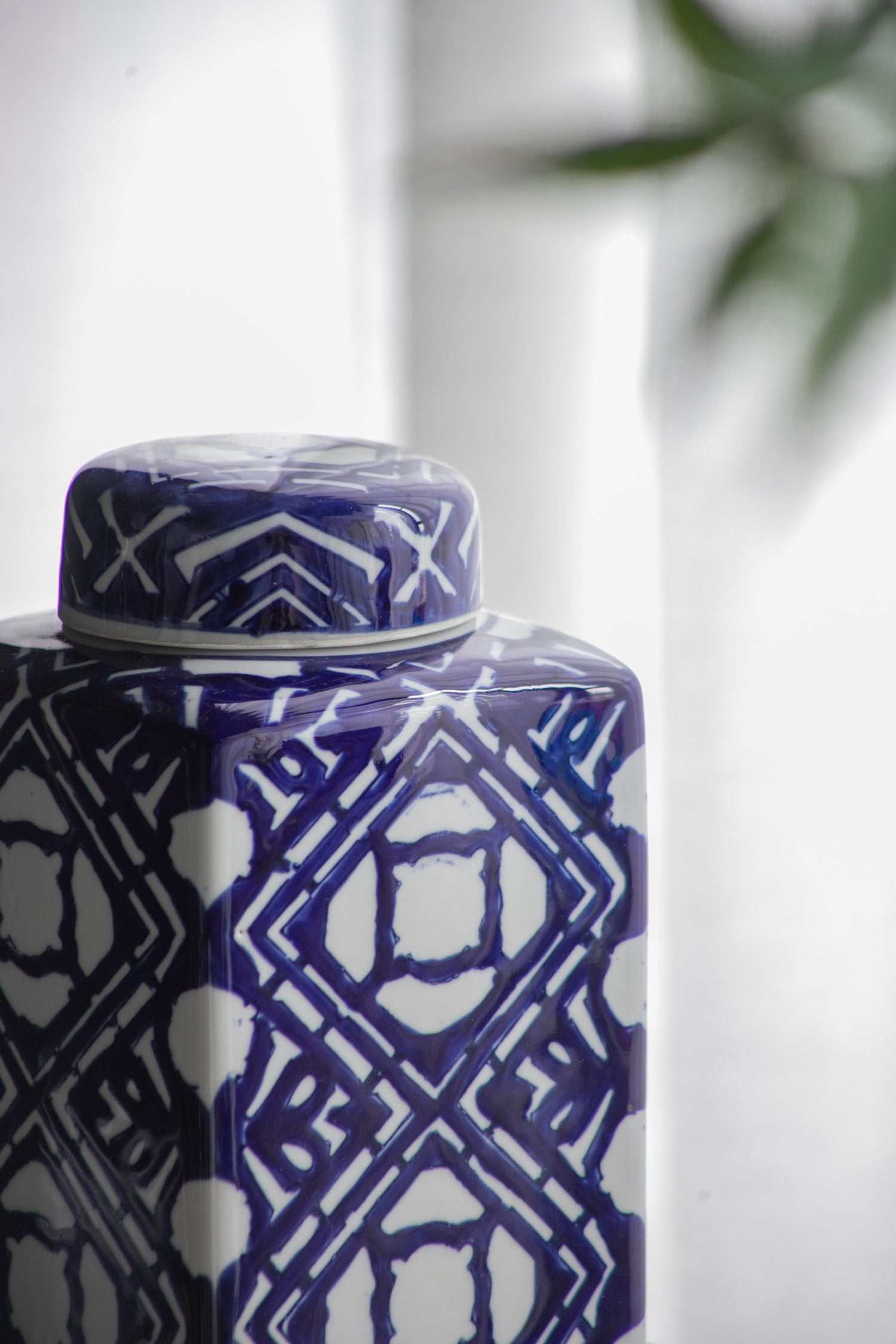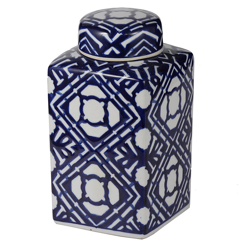 - Masterfully blending modern minimalism and classic charm, this accent jar features a sleek rectangular silhouette adorned with bold blue and white geometric patterns.