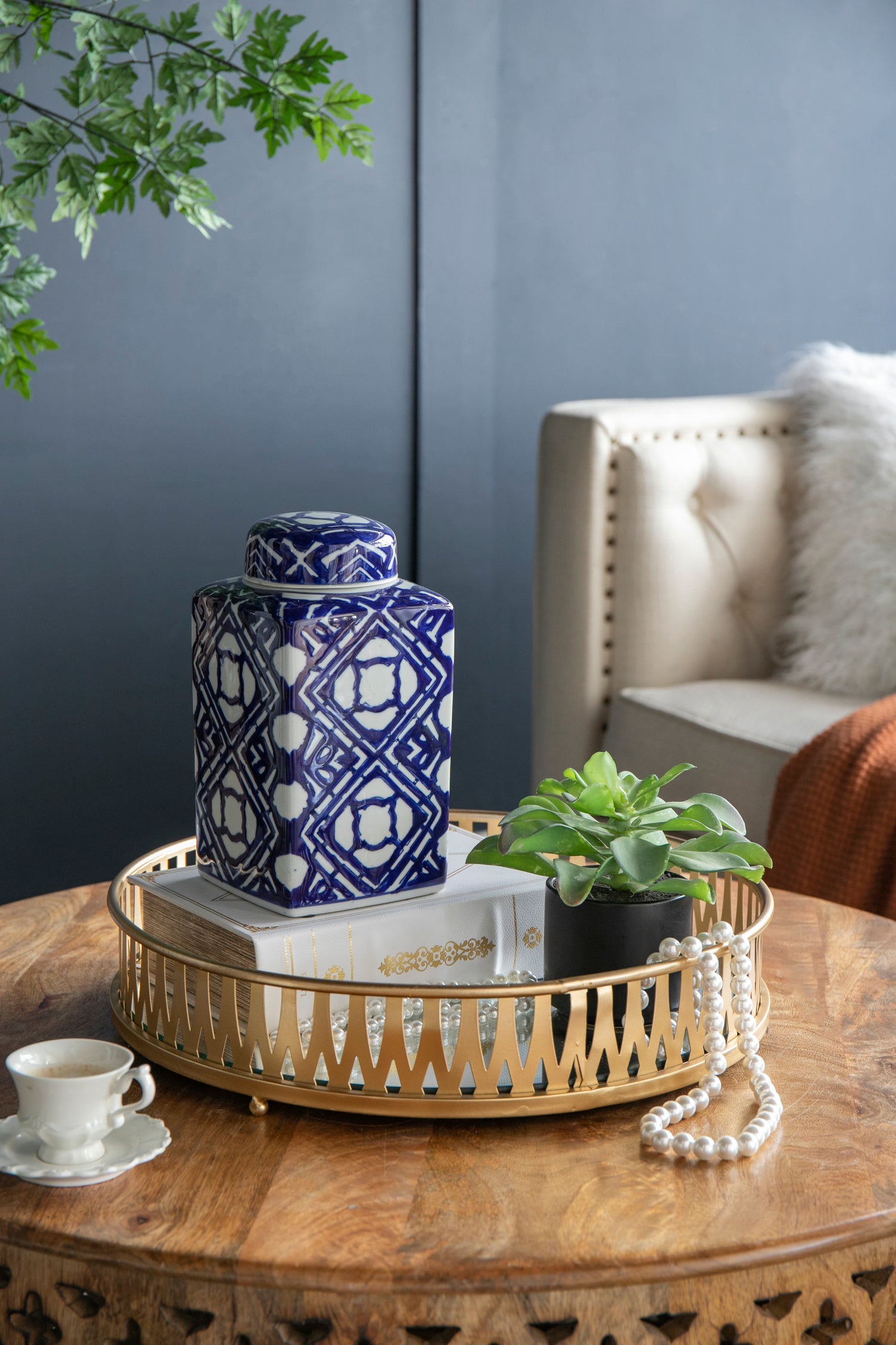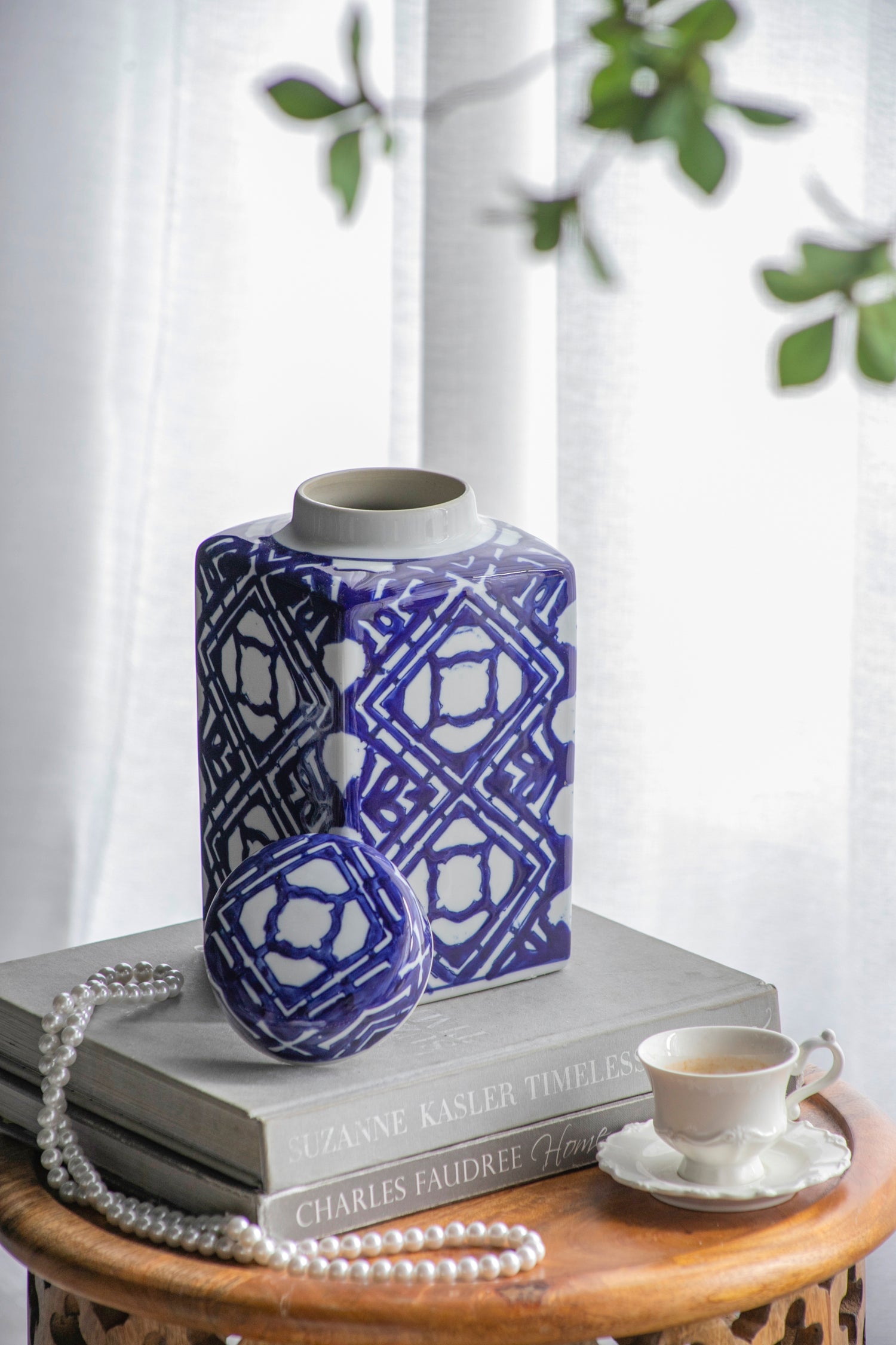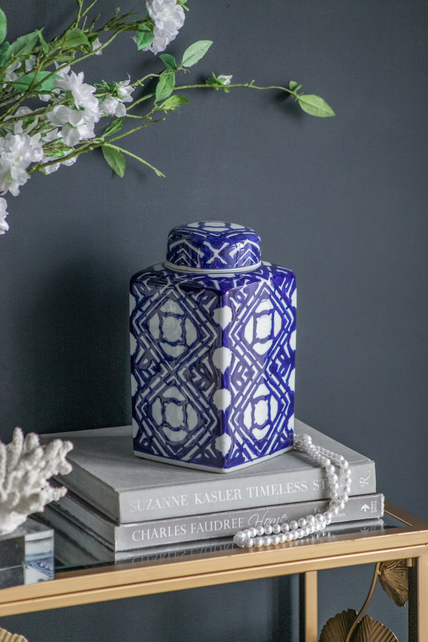 - Masterfully blending modern minimalism and classic charm, this accent jar features a sleek rectangular silhouette adorned with bold blue and white geometric patterns.