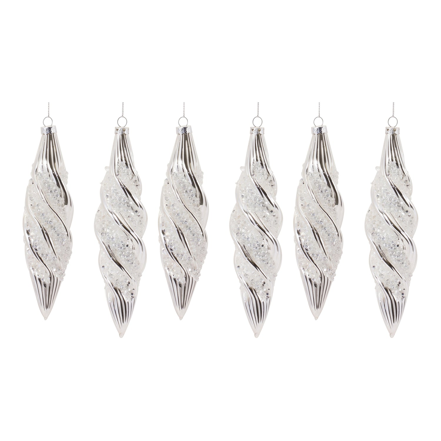 Adorn your Christmas tree and holiday decor with this stunning set of Beaded Glass Swirl Ornaments. Featuring 6 pieces, the chic silver and wintry white tones paired with the beaded design is the perfect combination to create a memorable display. The quality glass composition and delicate silver string hanging accent is sure to endure for seasons to come. Whether you're adding a touch of cheer to your home or gifting to a loved one, these ornaments will definitely bring smiles.