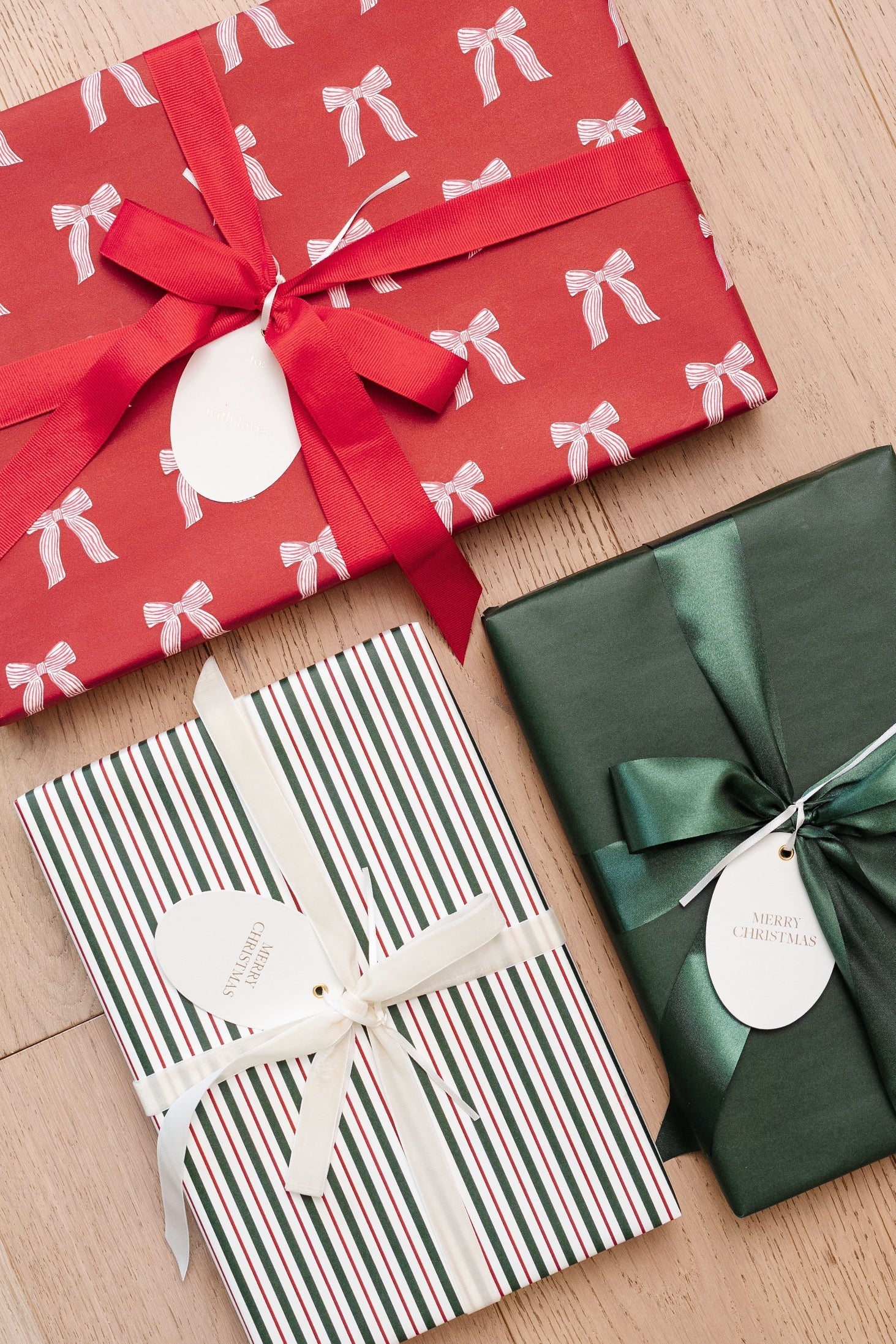 Wrapping Paper: Hand-drawn bows pattern, red-and-green stripe, and solid green. Each roll measures 30” x 14’, printed on thick matte 100 gsm paper with grid lines on the back for easy wrapping.