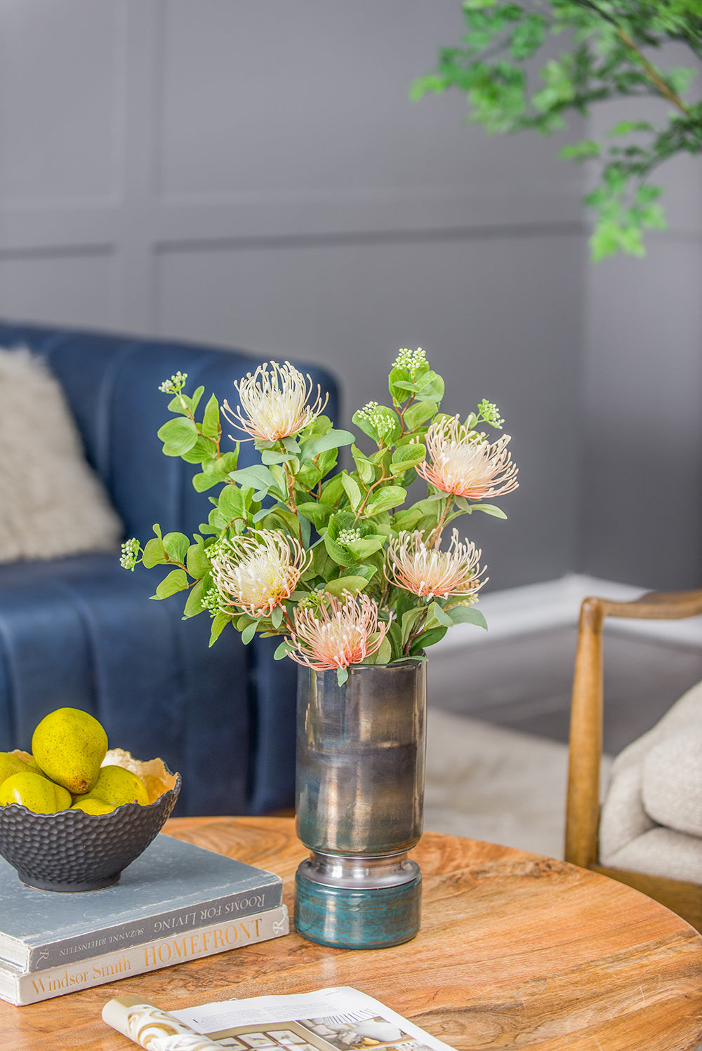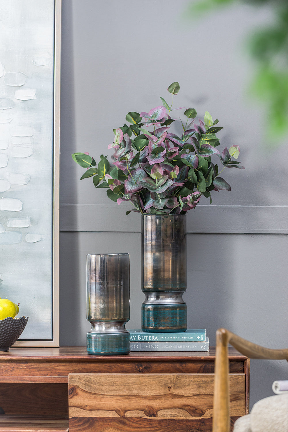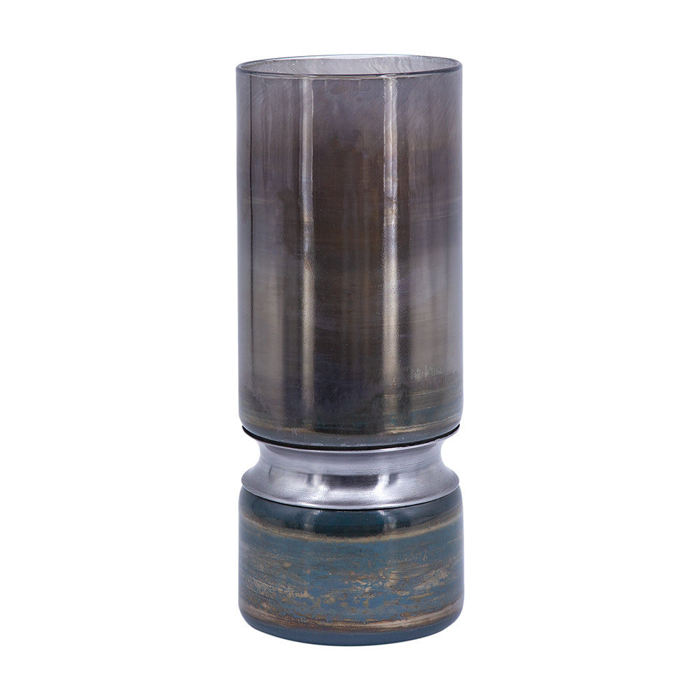 - Displaying a smokey blue glass accompanied by a chrome accent to add emphasize to the modified hourglass shape of the vase, offering a contemporary design.