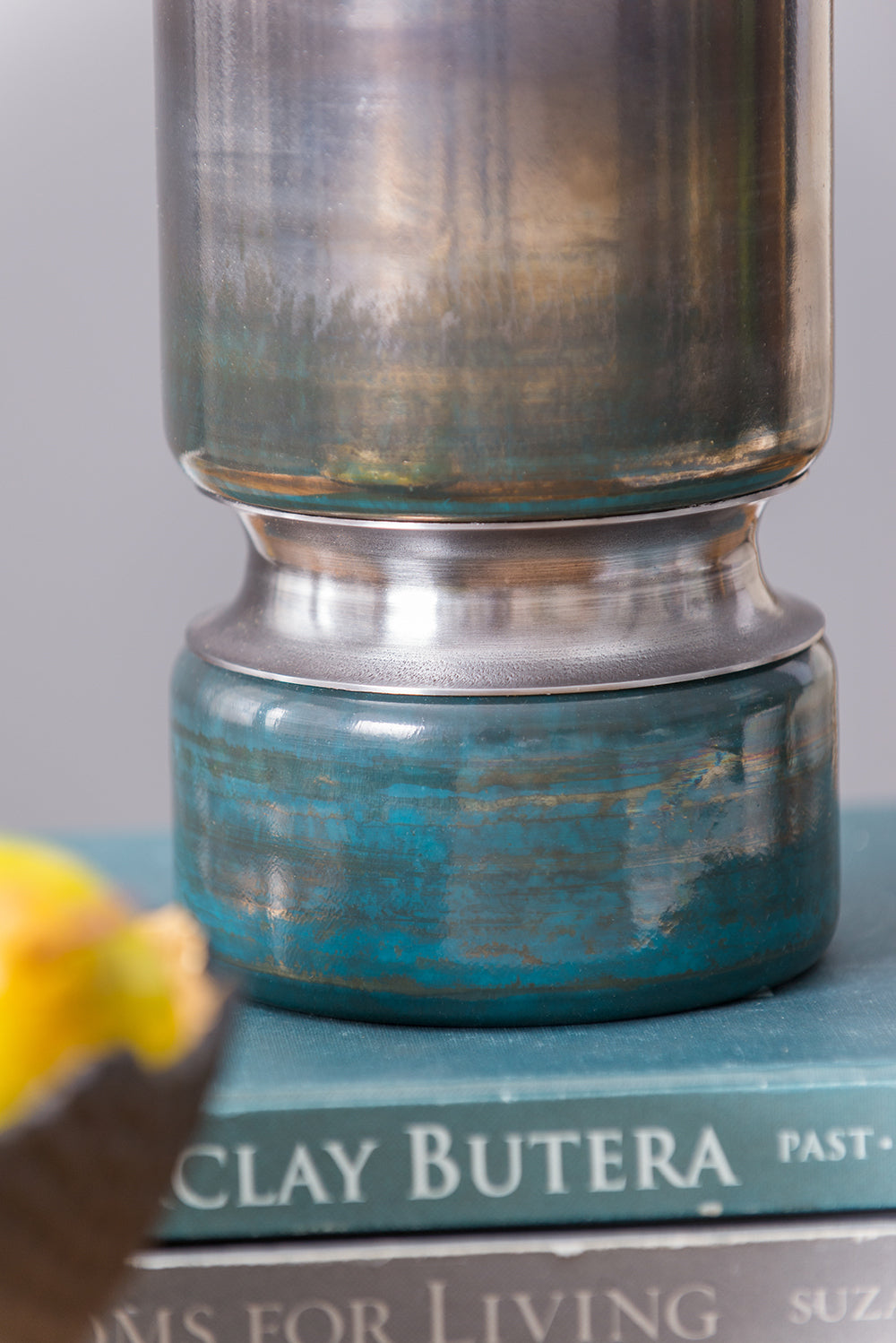 Smokey and sublet is exactly what you get from the Stellar Glass Vase. Displaying a smokey blue glass accompanied by a chrome accent to add emphasize to the modified hourglass shape of the vase, offering a contemporary design. Drawing inspiration from the night sky, the black and blues create the depths of the midnight sky with soft touched of gray as stars.