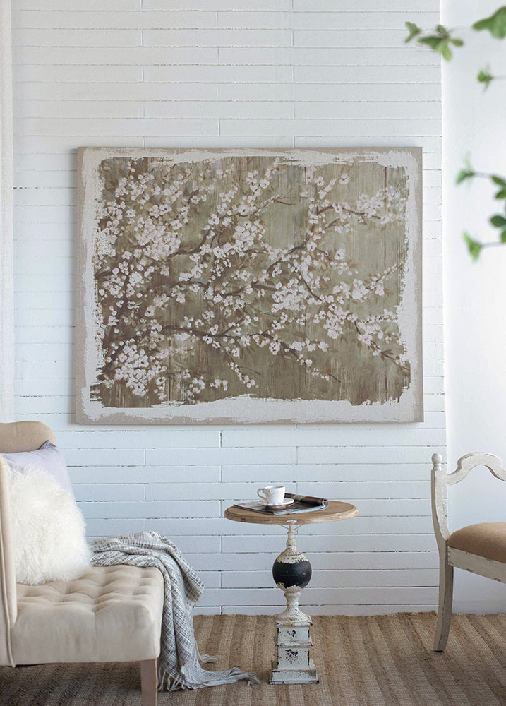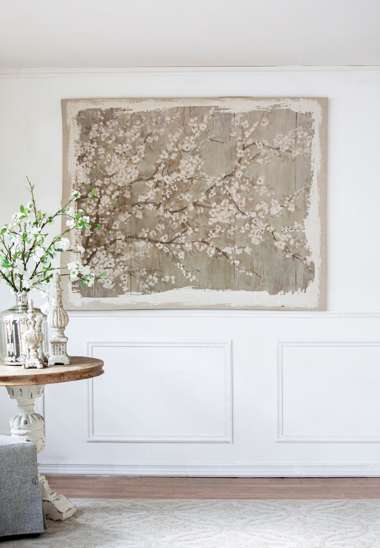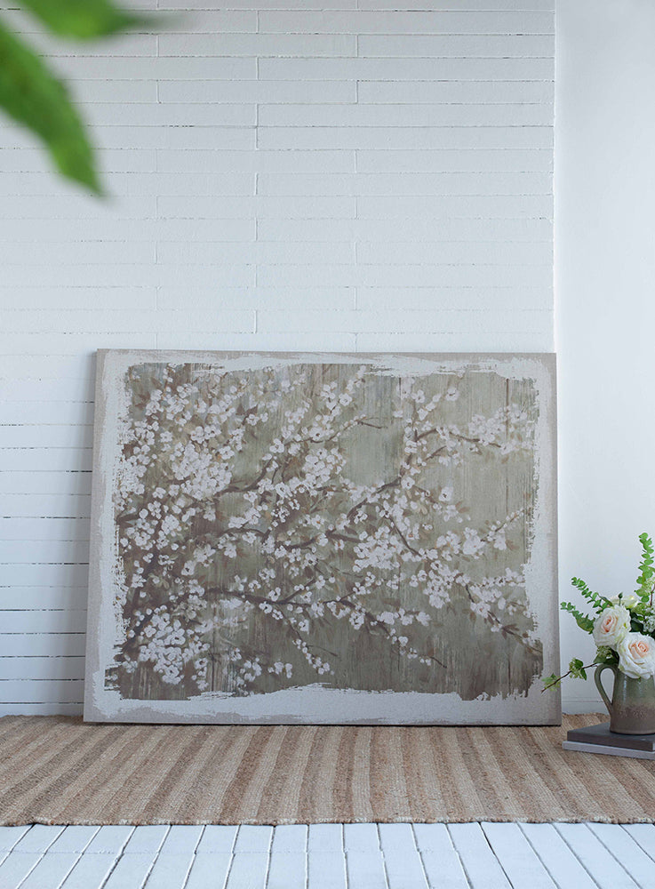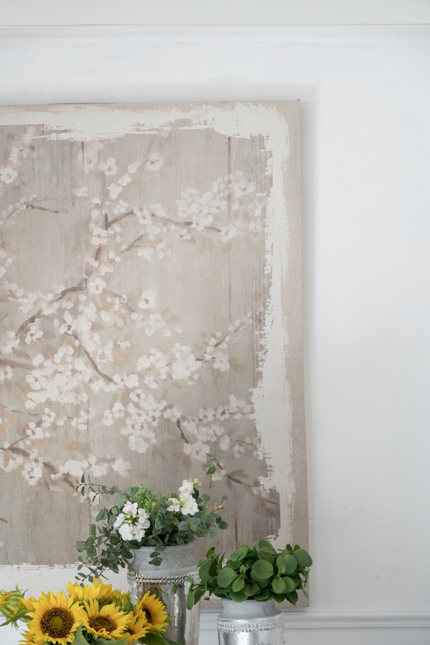 Let the soft, luminous beauty of this cherry blossom print carry the imagination away with its wispy grace and charm. This piece will serve as an intriguing focal point in your living room, bedroom, or office. Completing the alluring visuals, the neutral blend of white and gray tones reflects the calming aura of nature while also allowing the canvas to complement most interior styles.