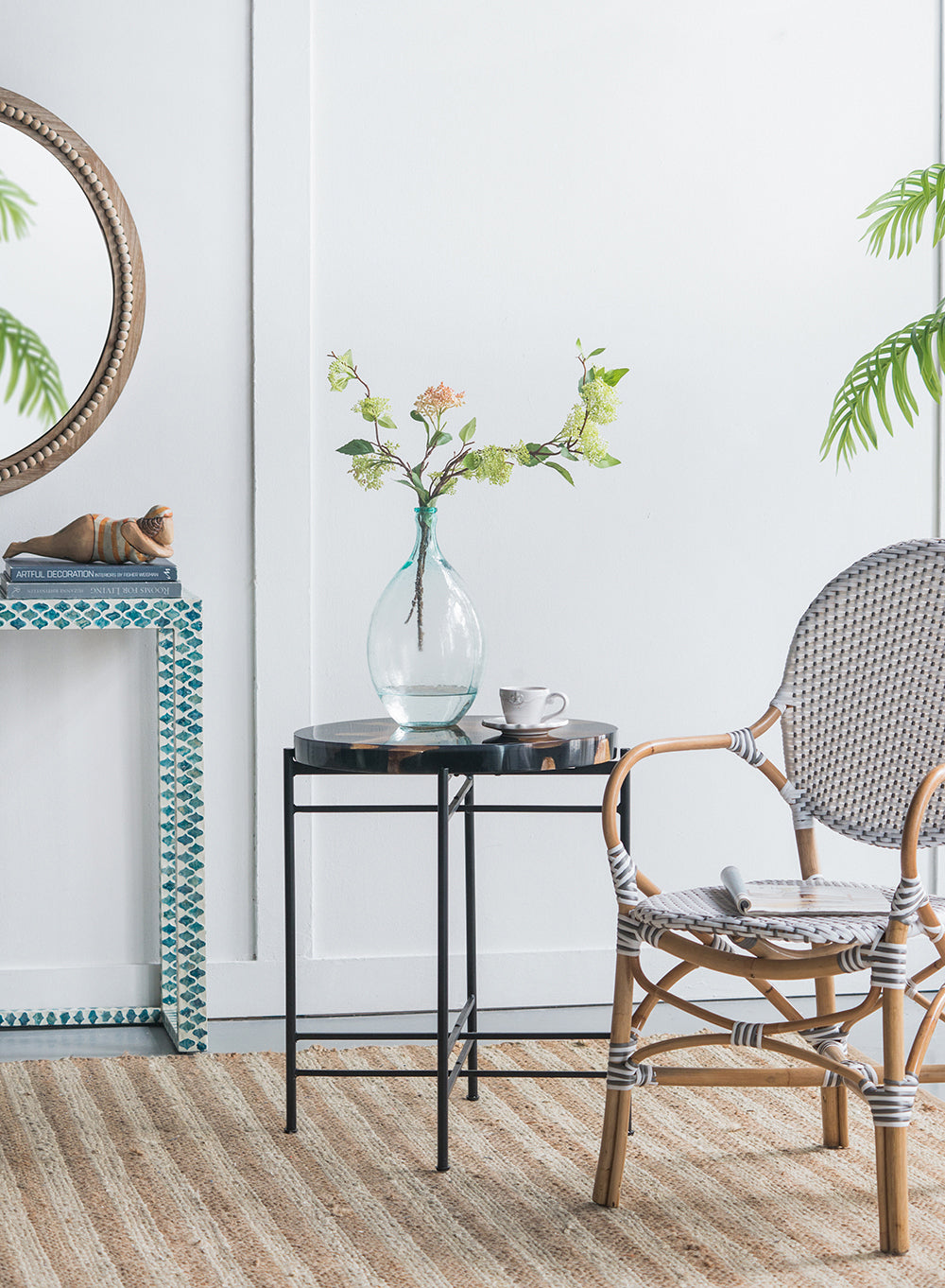 - Drawing inspiration from modern, classic, and industrial motifs, this side table boasts a unique shaped silhouette, a creatively styled metal frame, and a sleek round tabletop.