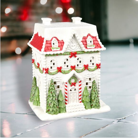 Experience the charm and warmth of a bustling brownstone village with our 16" City Sidewalks container. With a white base adorned with green trees and pops of red trim, this piece creates a cozy, nostalgic feel. Add it to your home decor and bring the city streets to life!
