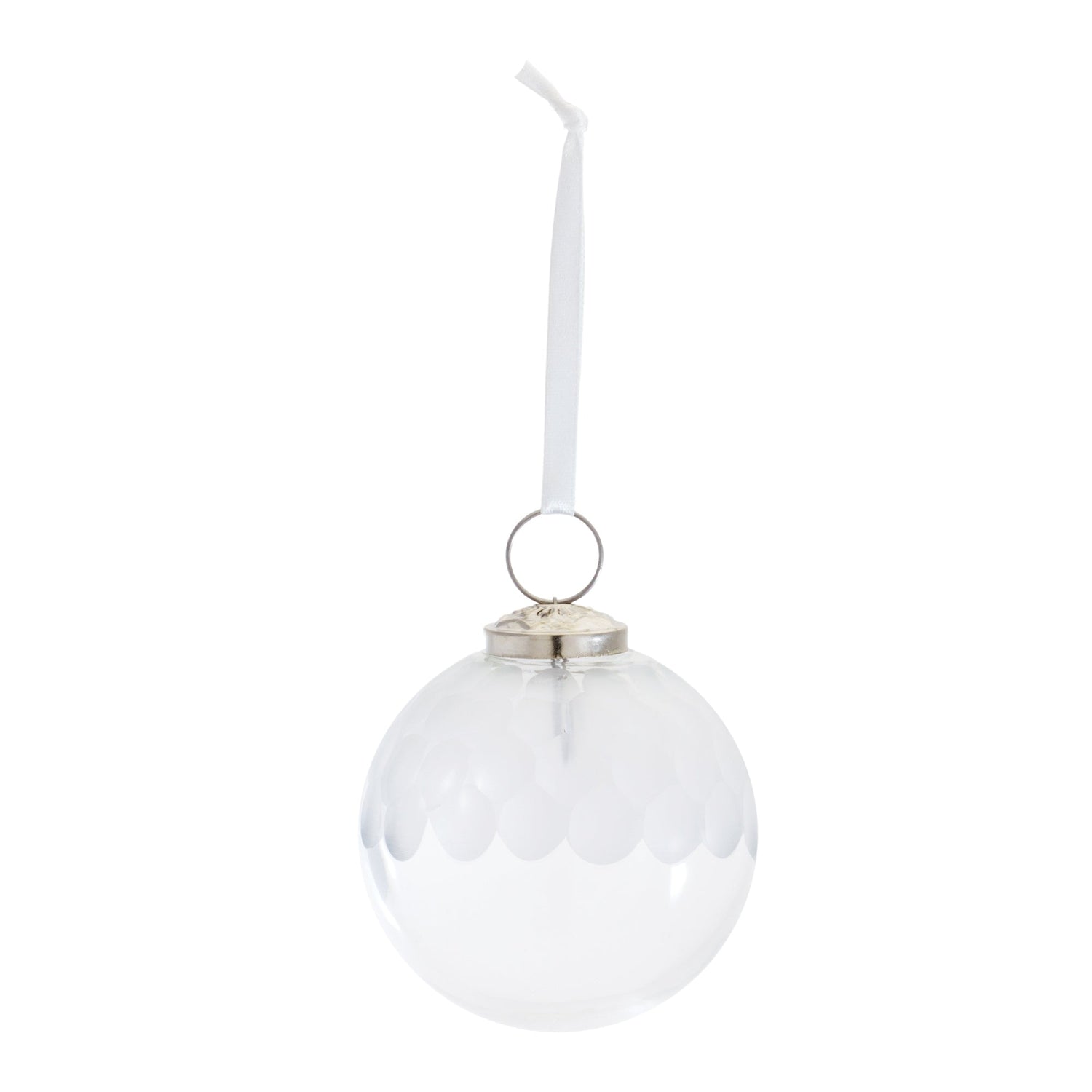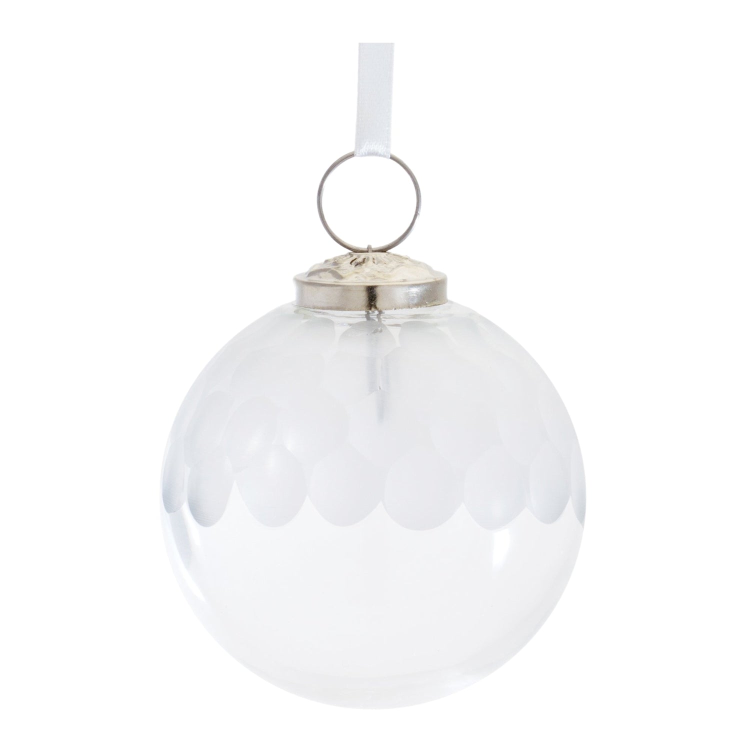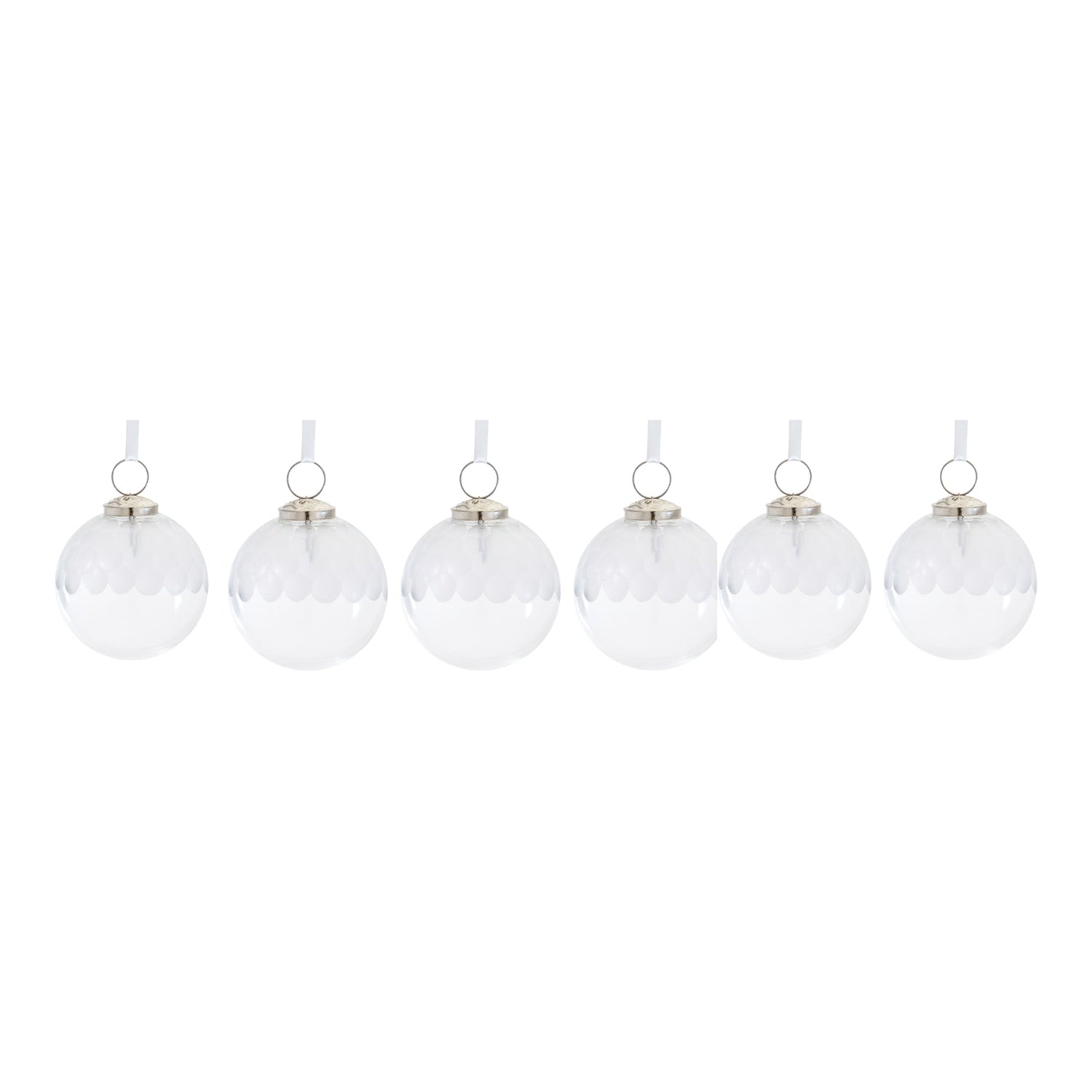 Adorn your Christmas tree and holiday decor with this stunning set of Clear Glass Ball Ornaments. Featuring 6 pieces, the versitile clear tones paired with the etched design is the perfect combination to create a memorable display. The quality glass composition and delicate ribbon hanging accent is sure to endure for seasons to come. Whether you're adding a touch of cheer to your home or gifting to a loved one, these ornaments will definitely bring smiles.