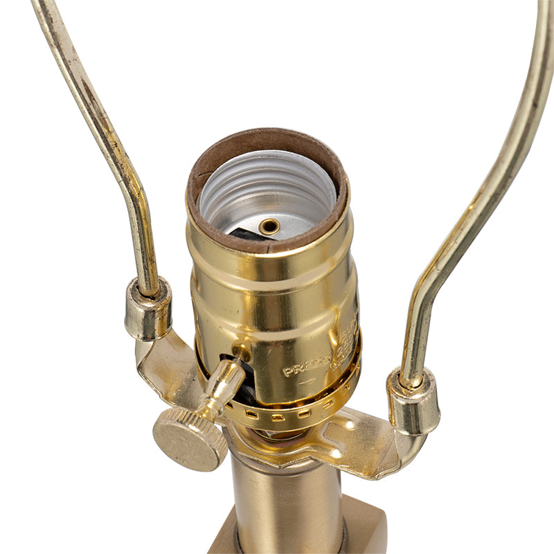- Featuring a square pedestal base and thin body finished in a golden hue, occasional white alabaster slab accents, and a classic white fabric drum shade, this piece is certain to draw the eye of your guests without overwhelming the space.