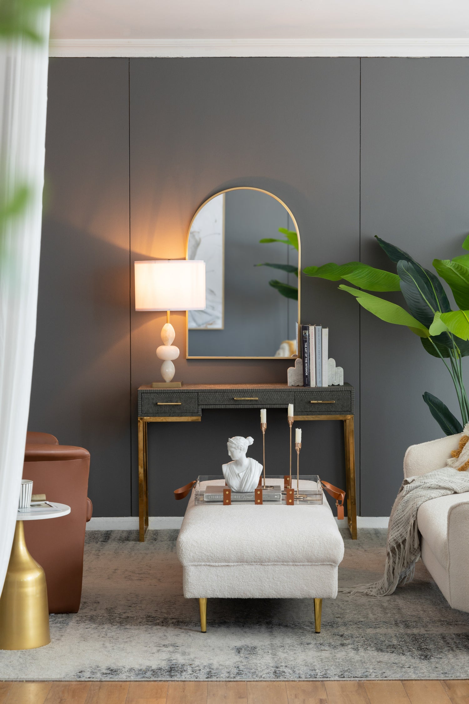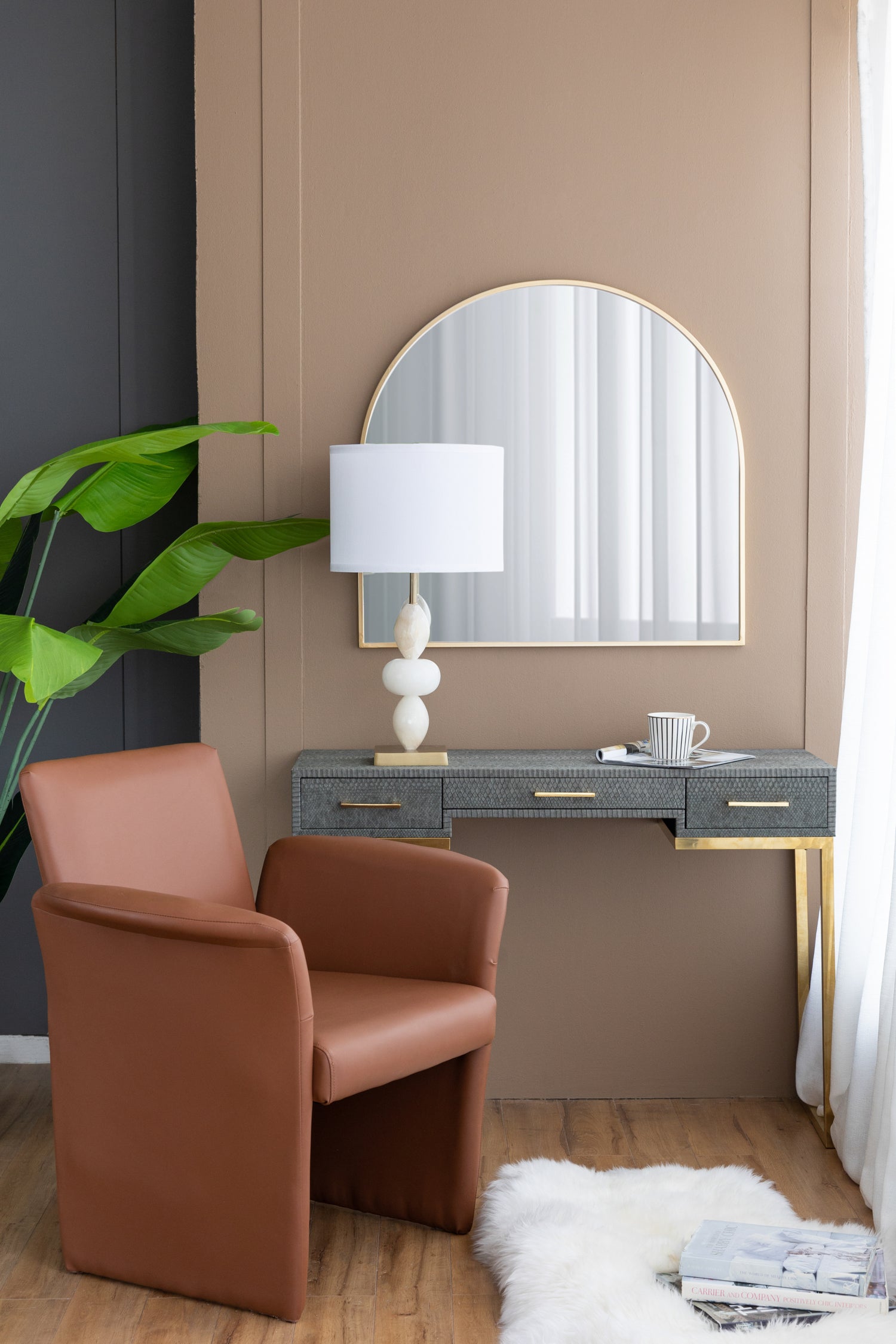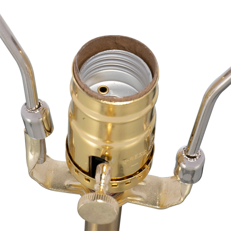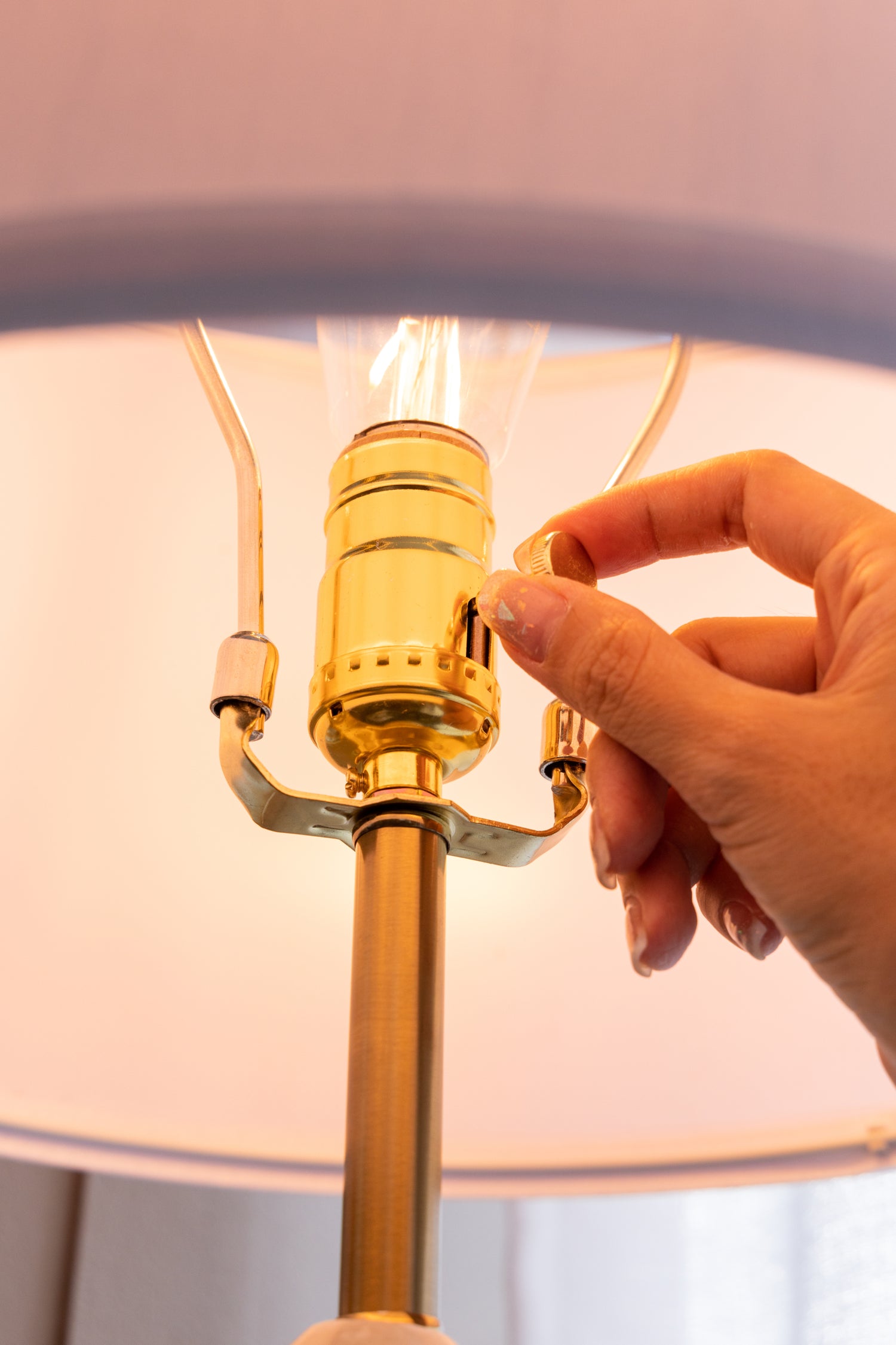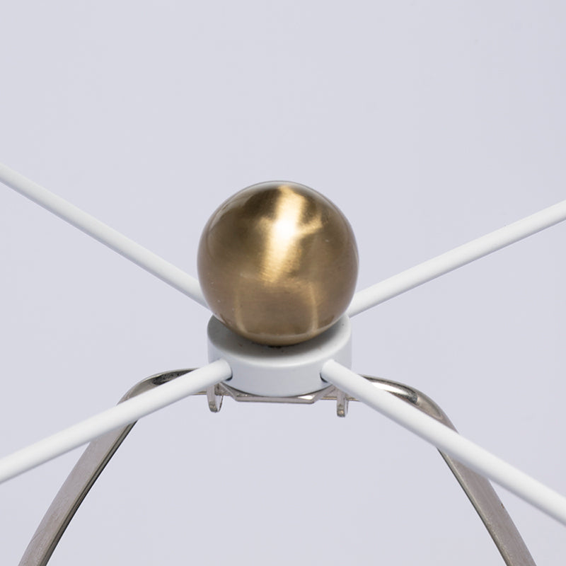 As contemporary as it is intriguing, this table lamp features three round alabaster accents, two vertical and one horizontal, a classic white drum shade, and a gold aluminum base. Measuring 26.3H x 14D x 14W, it is an ideal size for your bedside table, a desk in your study, or an end table anywhere in your house. Minimal assembly is required for the collapsible drum shade.