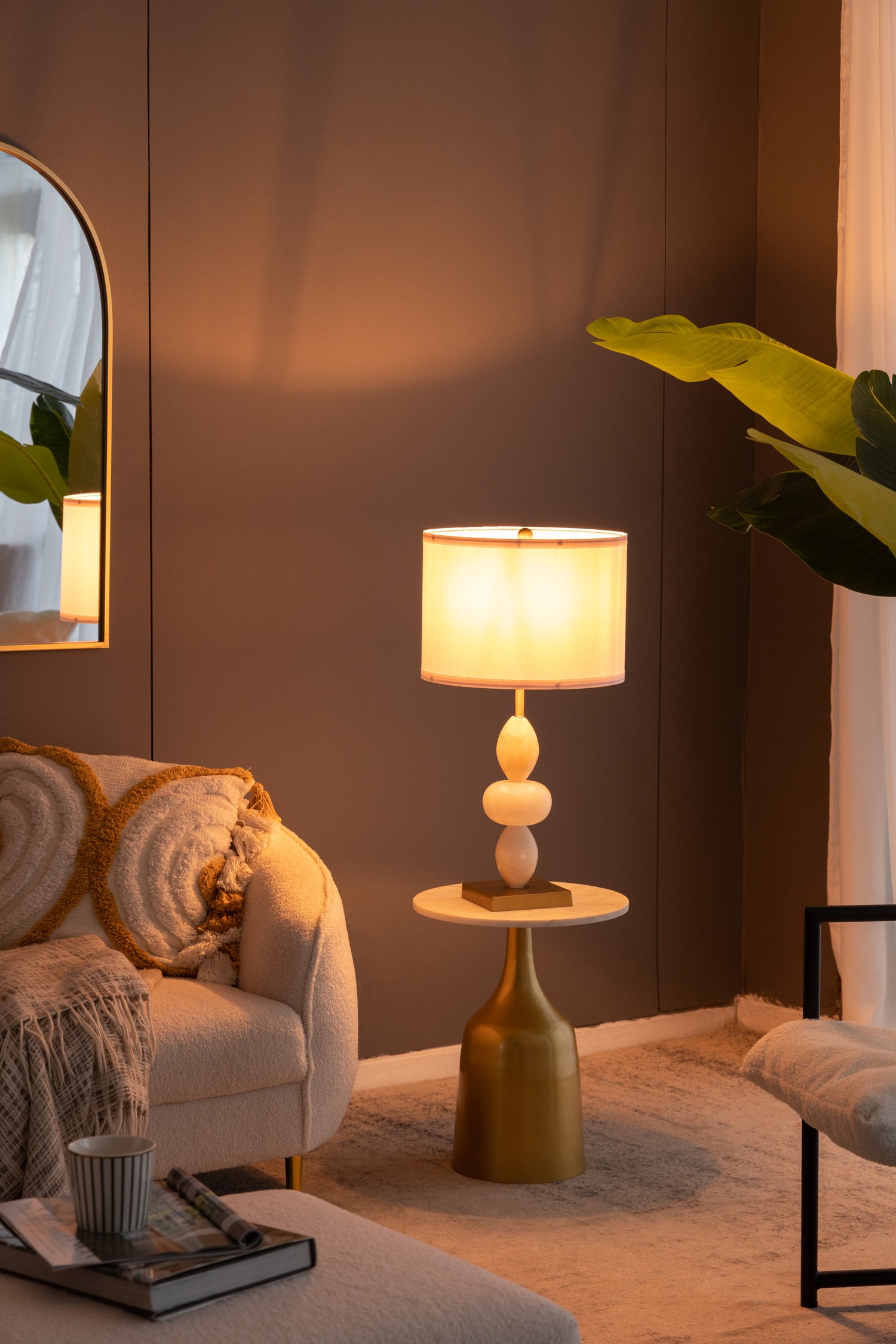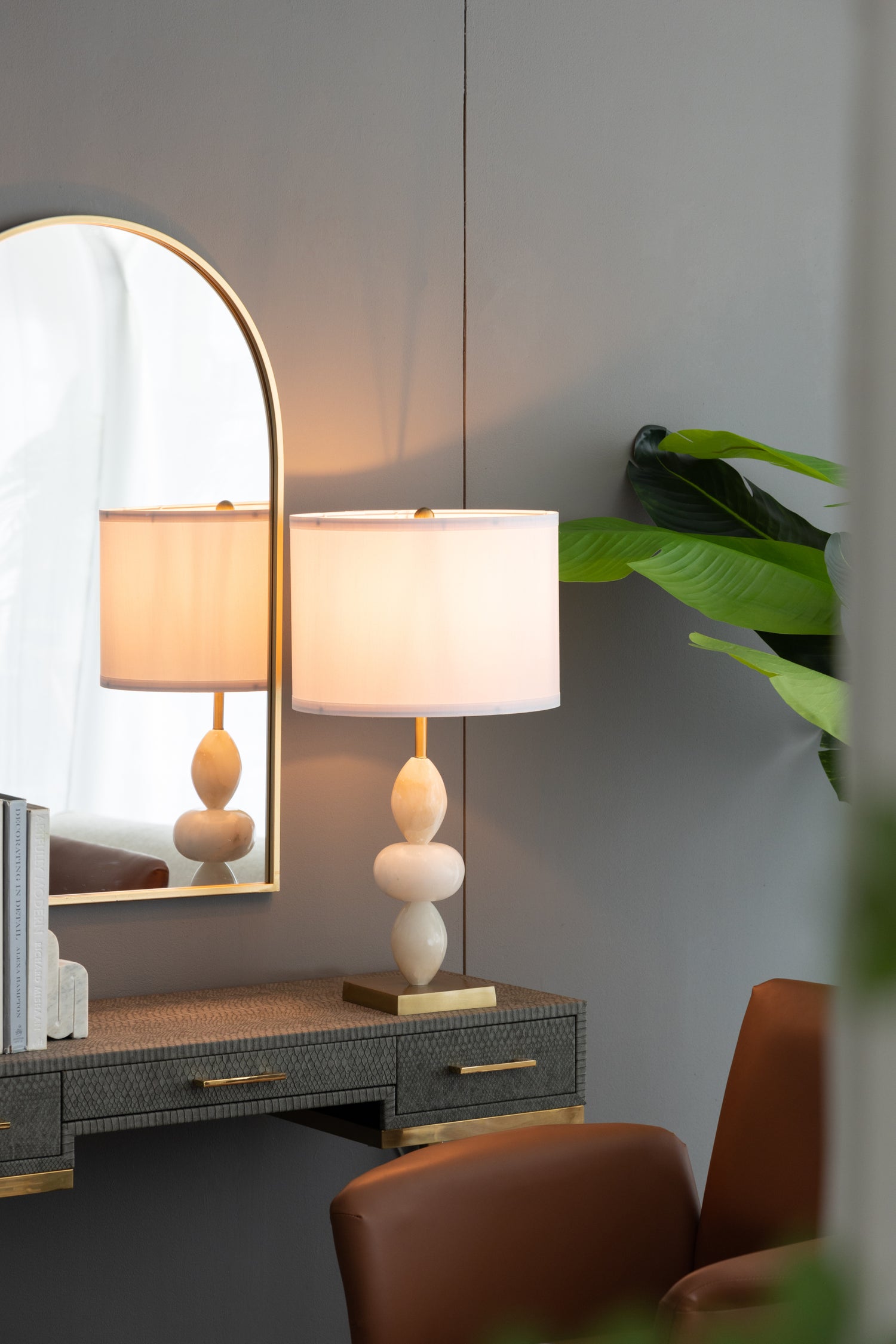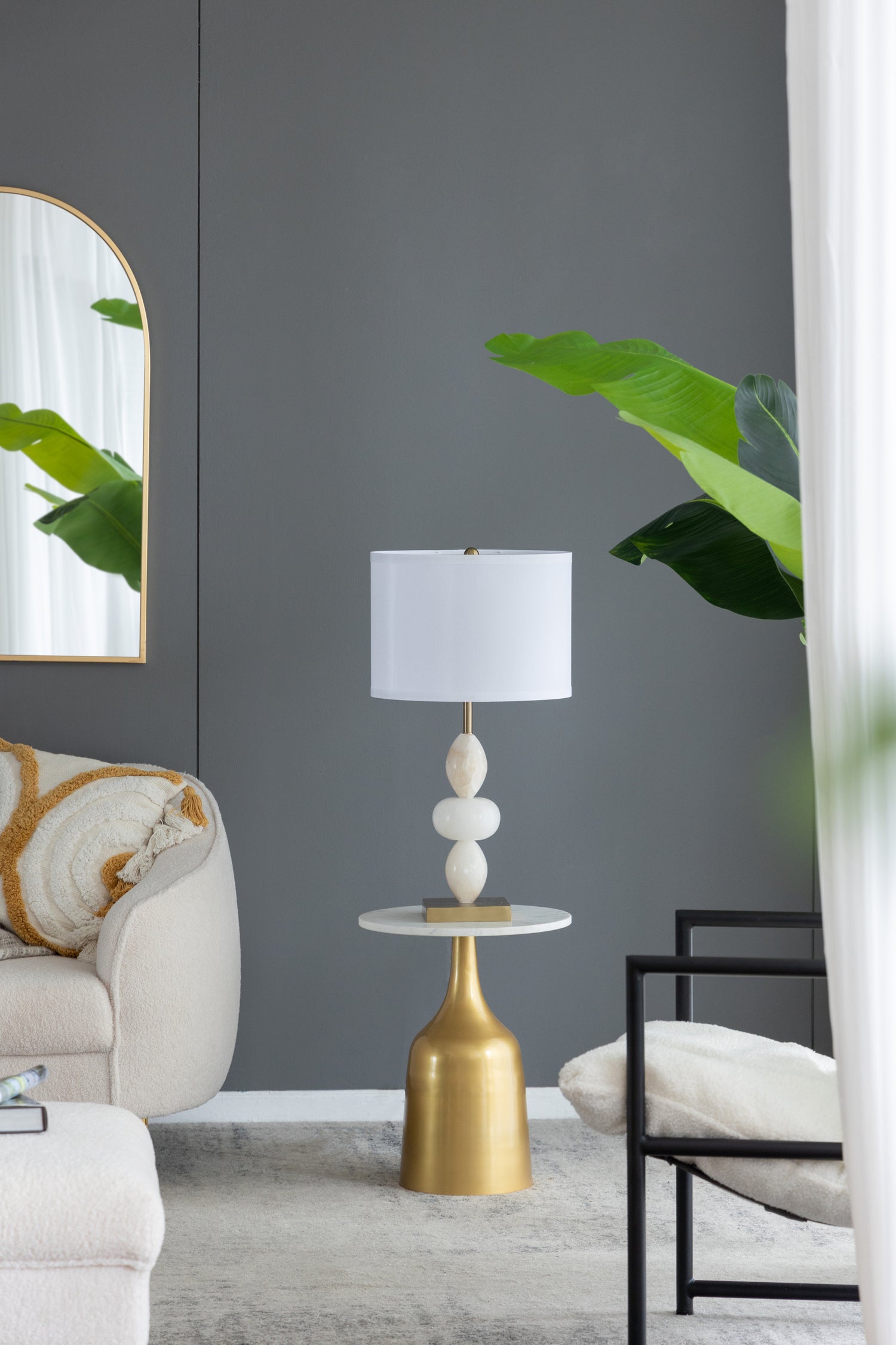 - As contemporary as it is intriguing, this table lamp features three round alabaster accents, two vertical and one horizontal, a classic white drum shade, and a gold aluminum base.