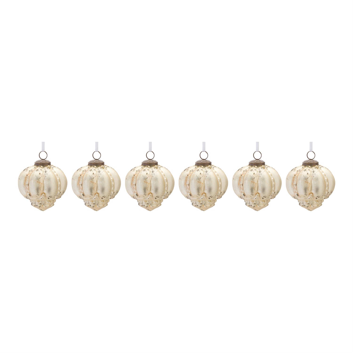 Adorn your Christmas tree and holiday decor with this stunning set of Harlequin Glass Ornaments. Featuring 6 pieces, the chic gold tones paired with the distressed design is the perfect combination to create a memorable display. The quality glass composition and delicate ribbon hanging accent is sure to endure for seasons to come. Whether you're adding a touch of cheer to your home or gifting to a loved one, these ornaments will definitely bring smiles.