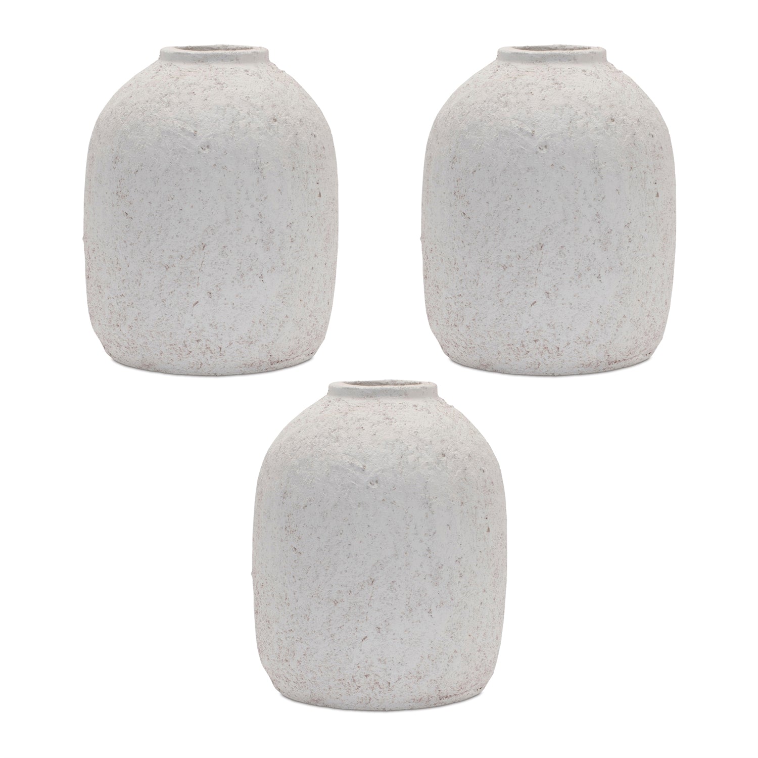 Enhance your home with this beautiful set of Decorative Terra Cotta Bud Vases. Featuring three pieces, this piece is a great fit for your country cottage or farmhouse style of decor. The cool white tones paired with the rustic distressed finish is perfect to create a stunning display. The quality terra cotta composition is sure to last for seasons to come. Complete the look by adding a bunch of dried florals or fresh garden flower buds to the vase, or gift it to a loved one to share the beauty!