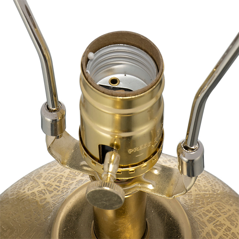 - Reinventing the traditional urn silhouette, this elegant table lamp features a round shape, a white fabric drum shade, a muted gold hue, and intricate artistic detailing across the surface.