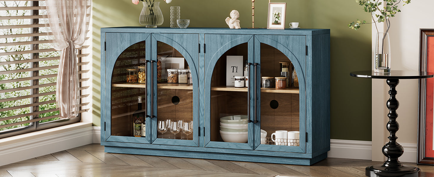 - Unique Design: This arched cabinet adopts a traditional retro style, adding uniqueness and personality to your furniture. The arched design of the four cabinet doors, paired with superior glass material, makes this sideboard buffet cabinet with storage stand out. Equipped with four durable metal linear handles and clear lines on the backboard when the cabinet door opens, it’s a practical and stylish choice.