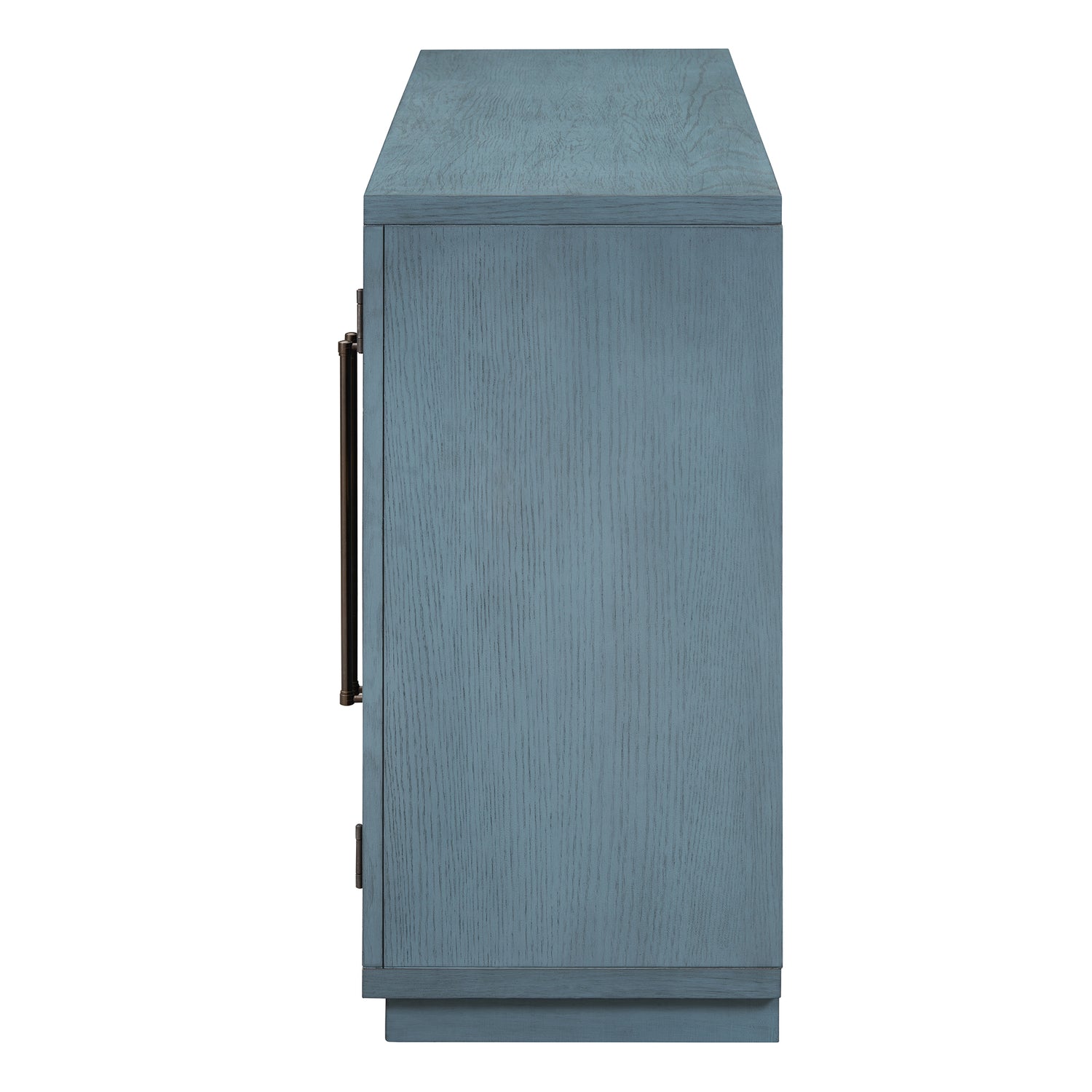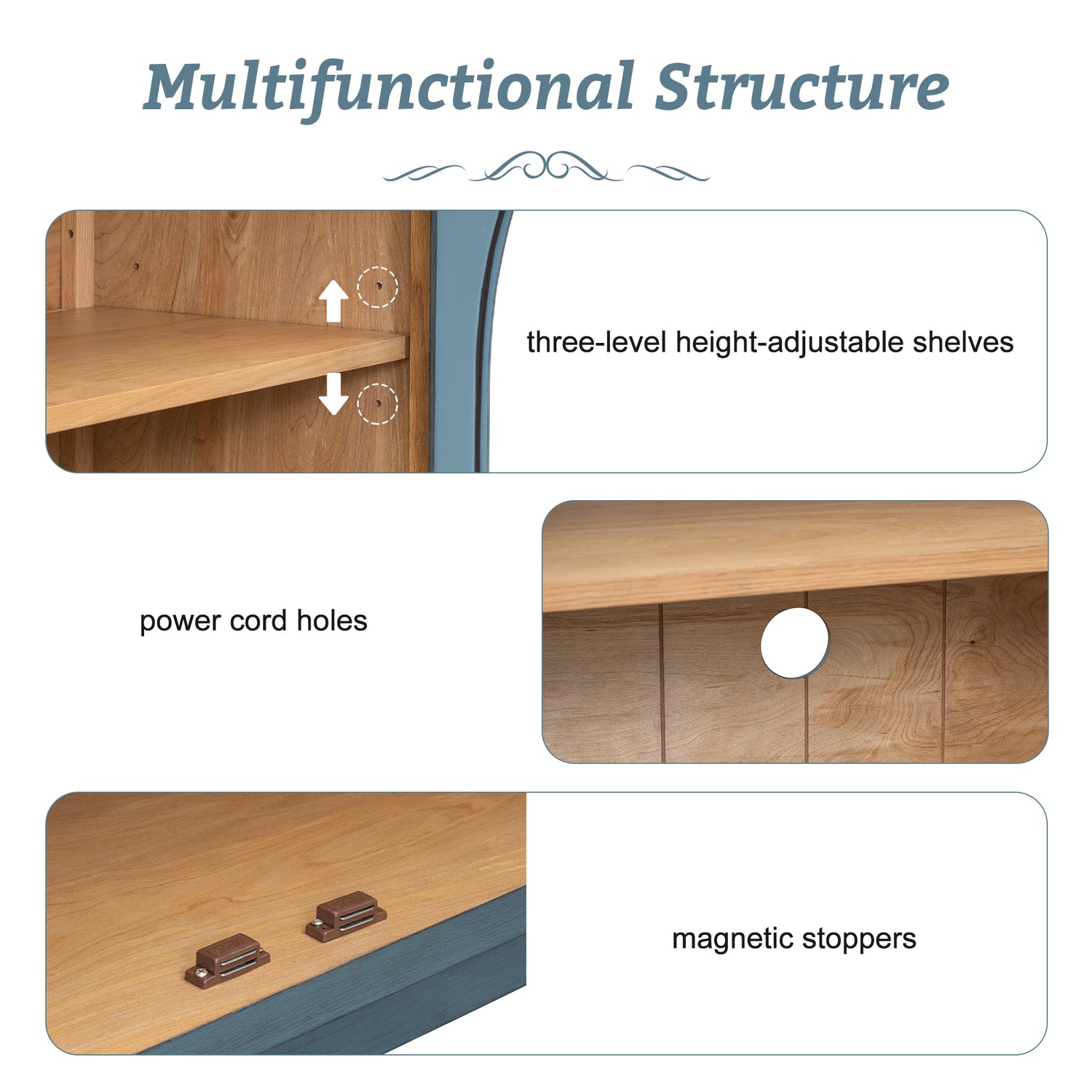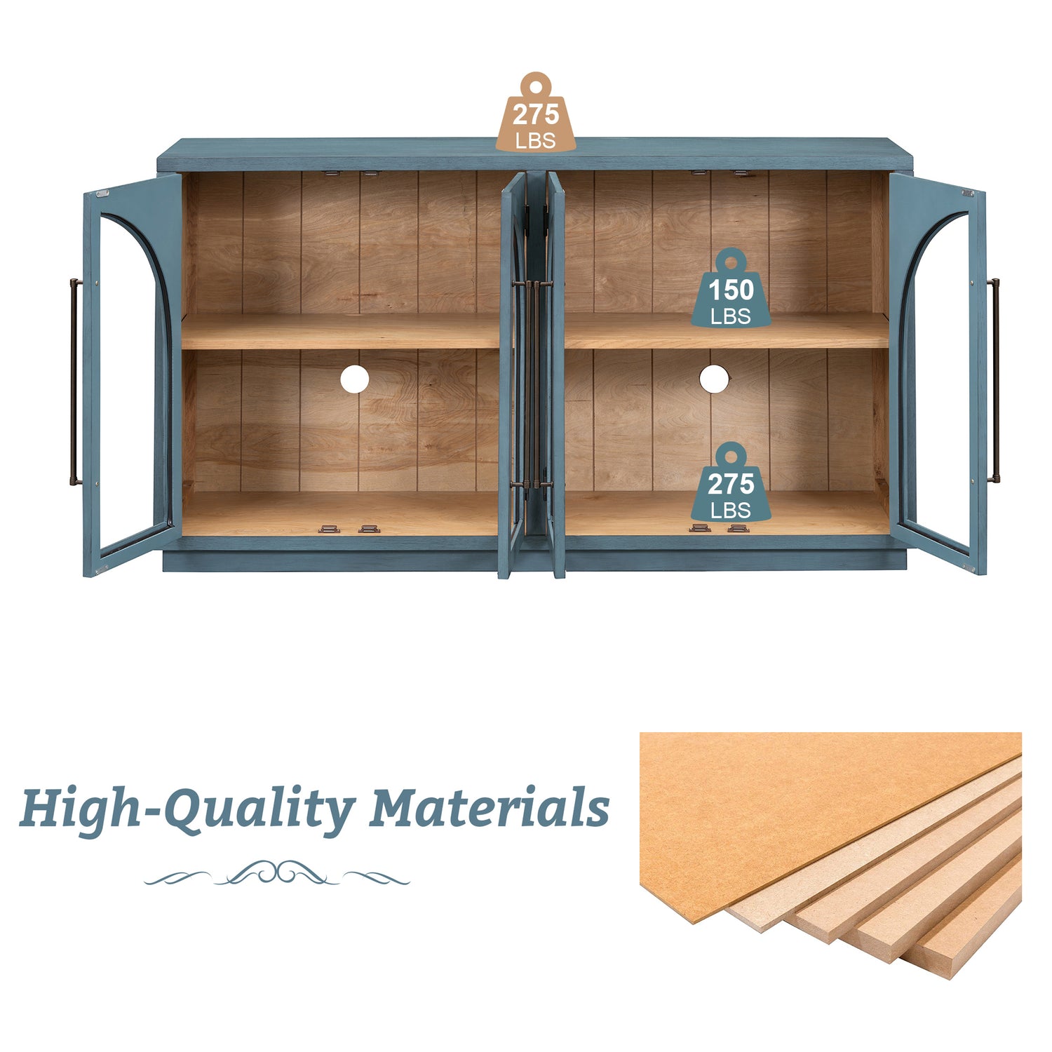 - Retro Style: This buffet cabinet with glass doors combines retro style with functionality. The surface of this wood sideboard features an aged paint effect and wire-drawing finish, creating a low-key yet classic appearance. The 4-door design provides ample storage space, making this sideboard cabinet a perfect addition to your home décor. Available in two colors—navy and black—it’s suitable for kitchens, dining rooms, and living rooms.