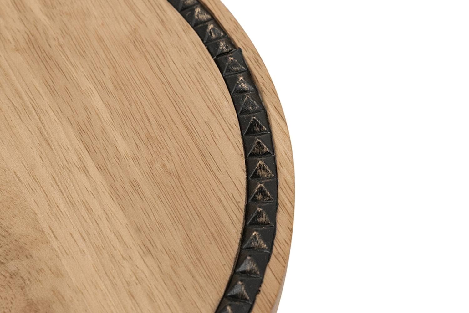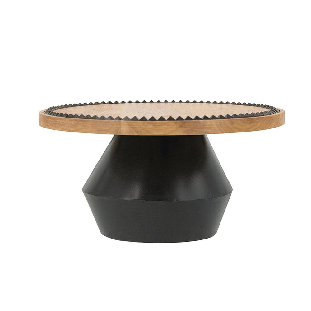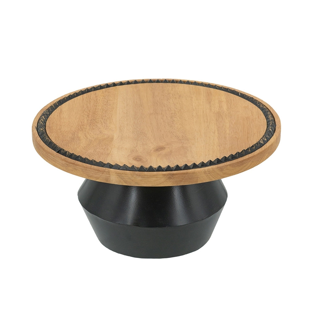 - Highlighting the artistic beauty of natural decor, this pedestal tray features a warm brown wooden top, bold black accents, and a sculptural iron base.