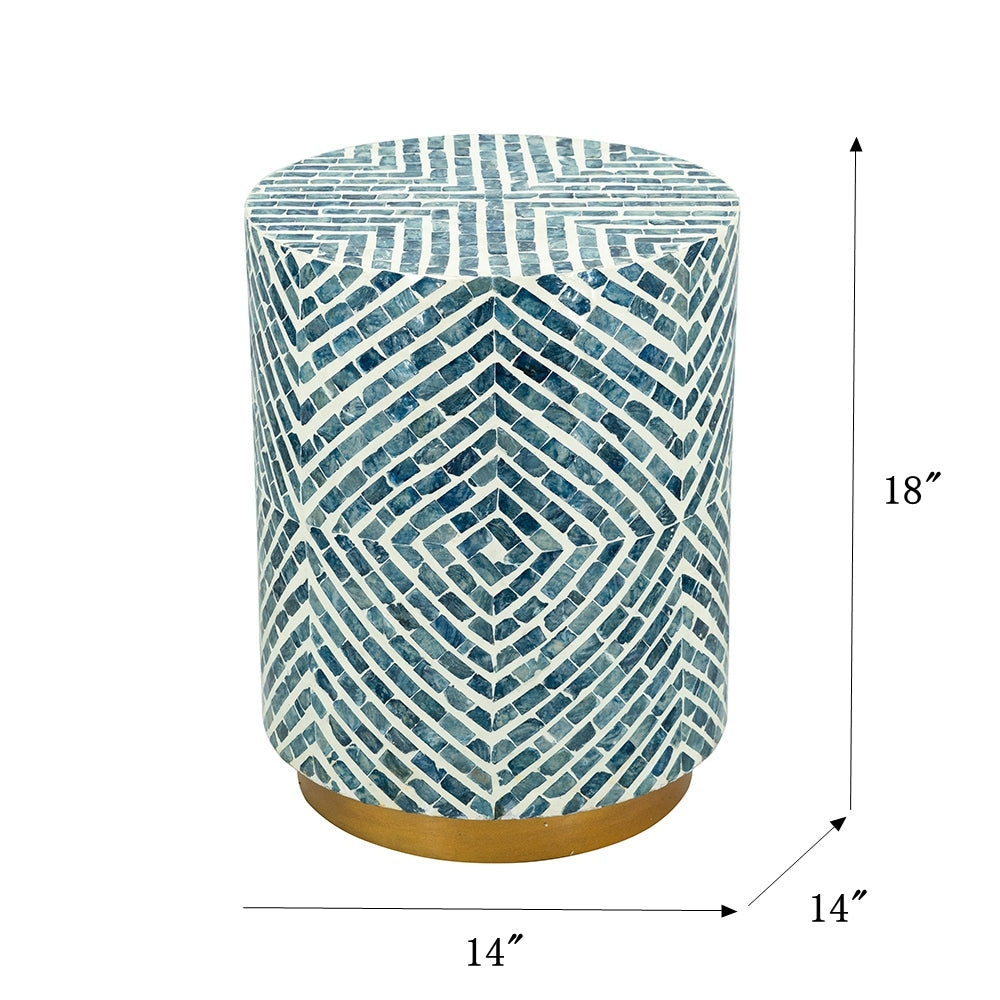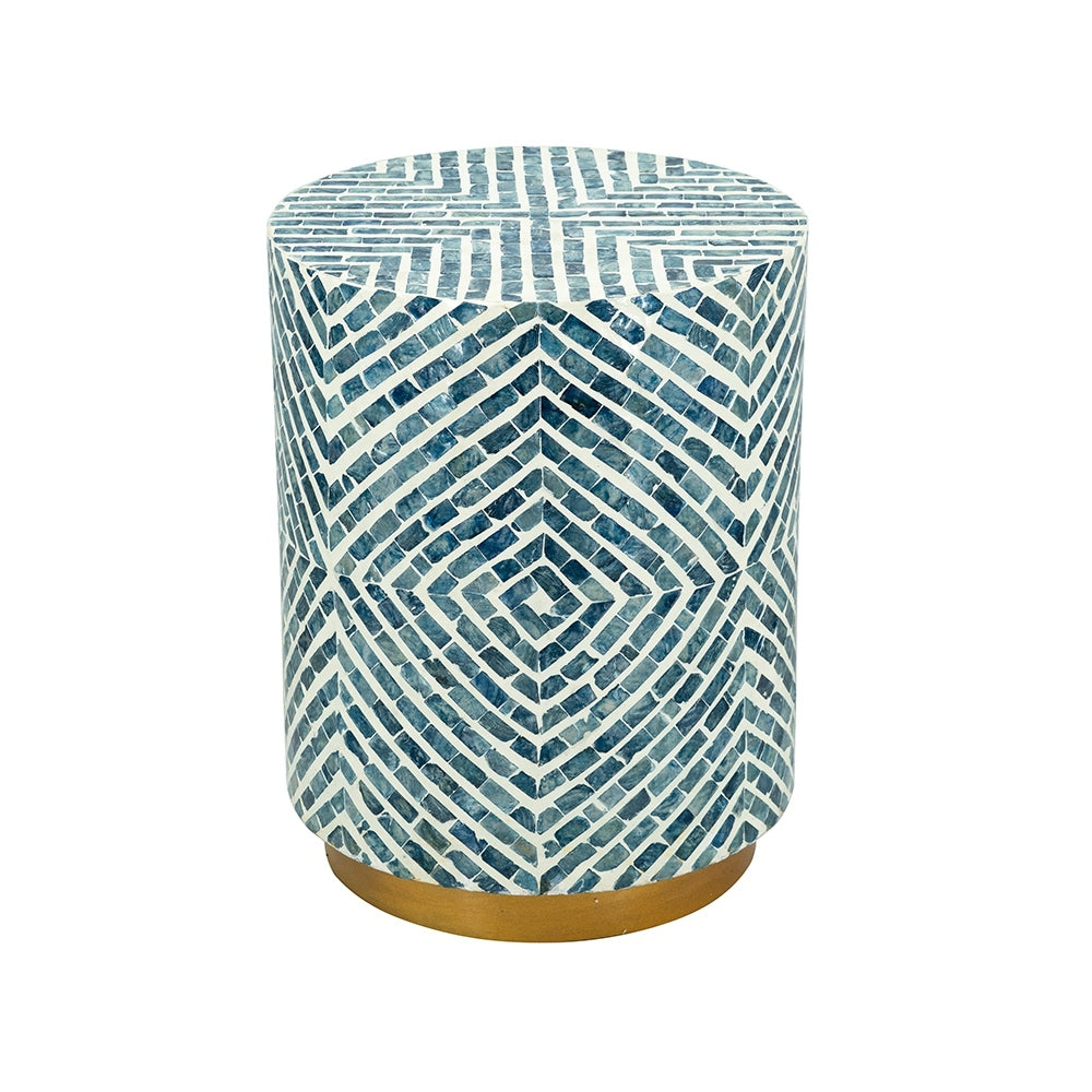 - Transforming natural materials into a refined work of art, this accent stool features a cylindrical silhouette, a mesmerizing blue and white capiz finish, and a sturdy gold base.