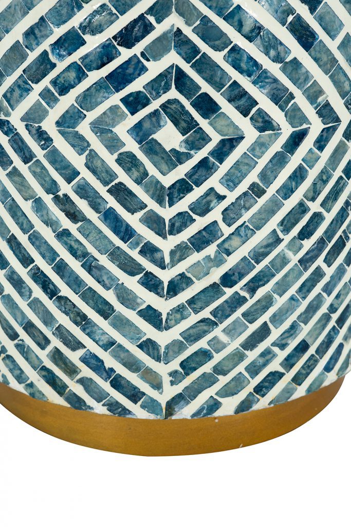 Transforming natural materials into a refined work of art, this accent stool features a cylindrical silhouette, a mesmerizing blue and white capiz finish, and a sturdy gold base. Offering great versatility, it can be used as a chairside table in your living room, a welcoming plant stand in your entryway, or extra seating for guests.