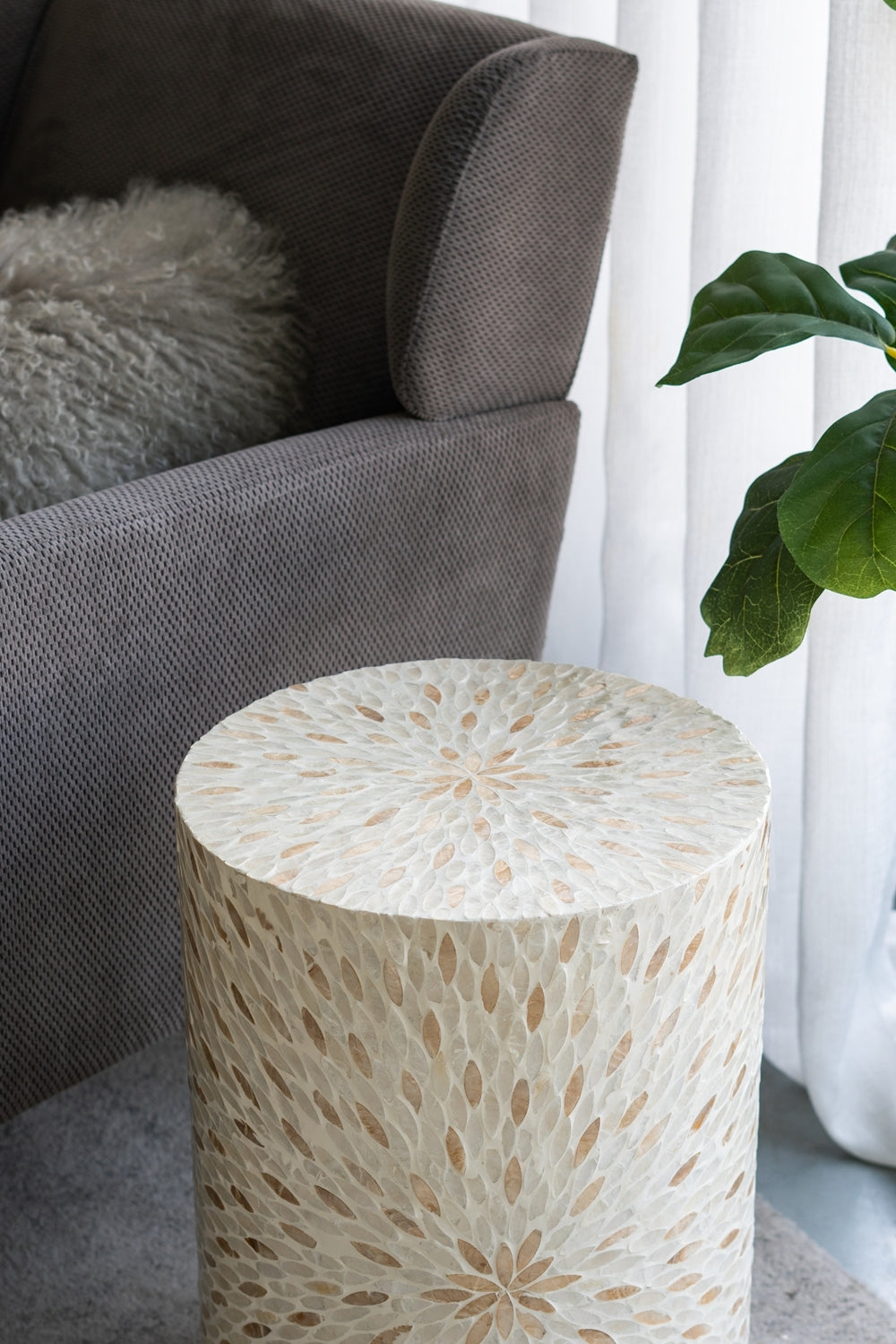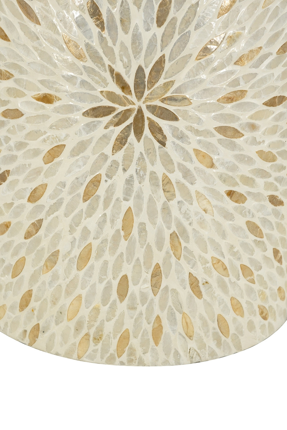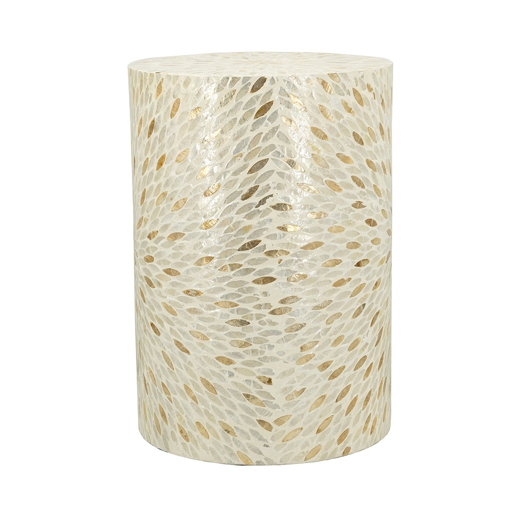 - Revitalizing the classic drum silhouette, this decorative stool features a captivating starburst design crafted entirely from capiz shells.