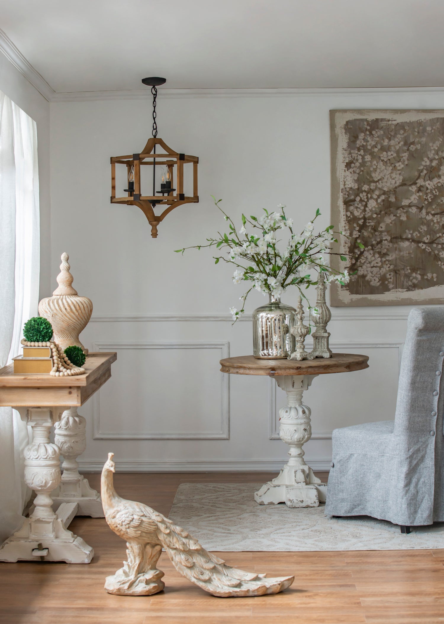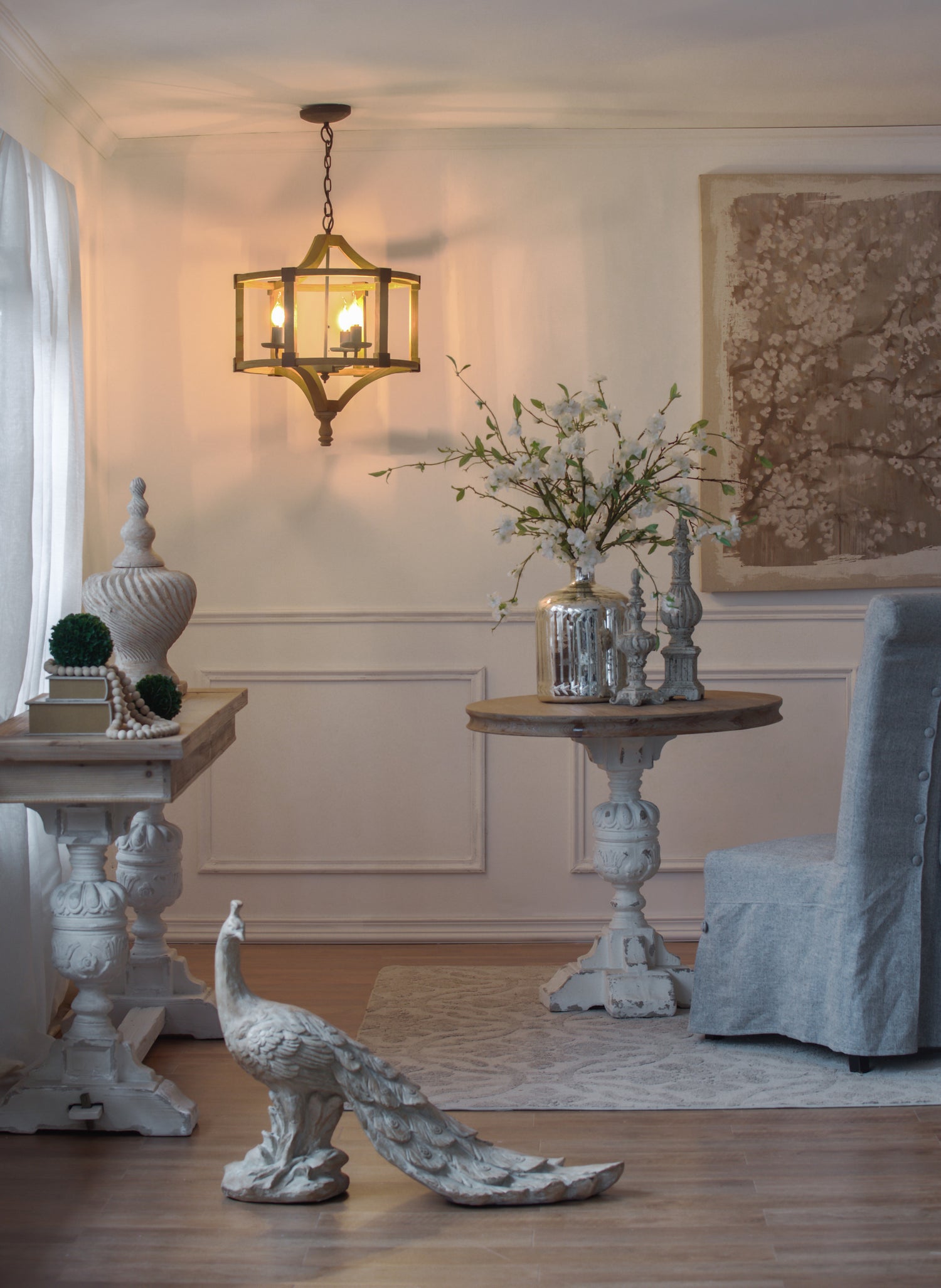 With its light whitewashed finish,iron corner brackets,and captivating blend of squares and arches,the Andreas Round Chandelier adds an elegant yet slightly industrial look to any space.Hang this stunning chandelier in a lofty foyer,above a rustic dining room table,or in a farmhouse kitchen.With its rugged details and simple style,this piece has a versatile look to complement a variety of decors.