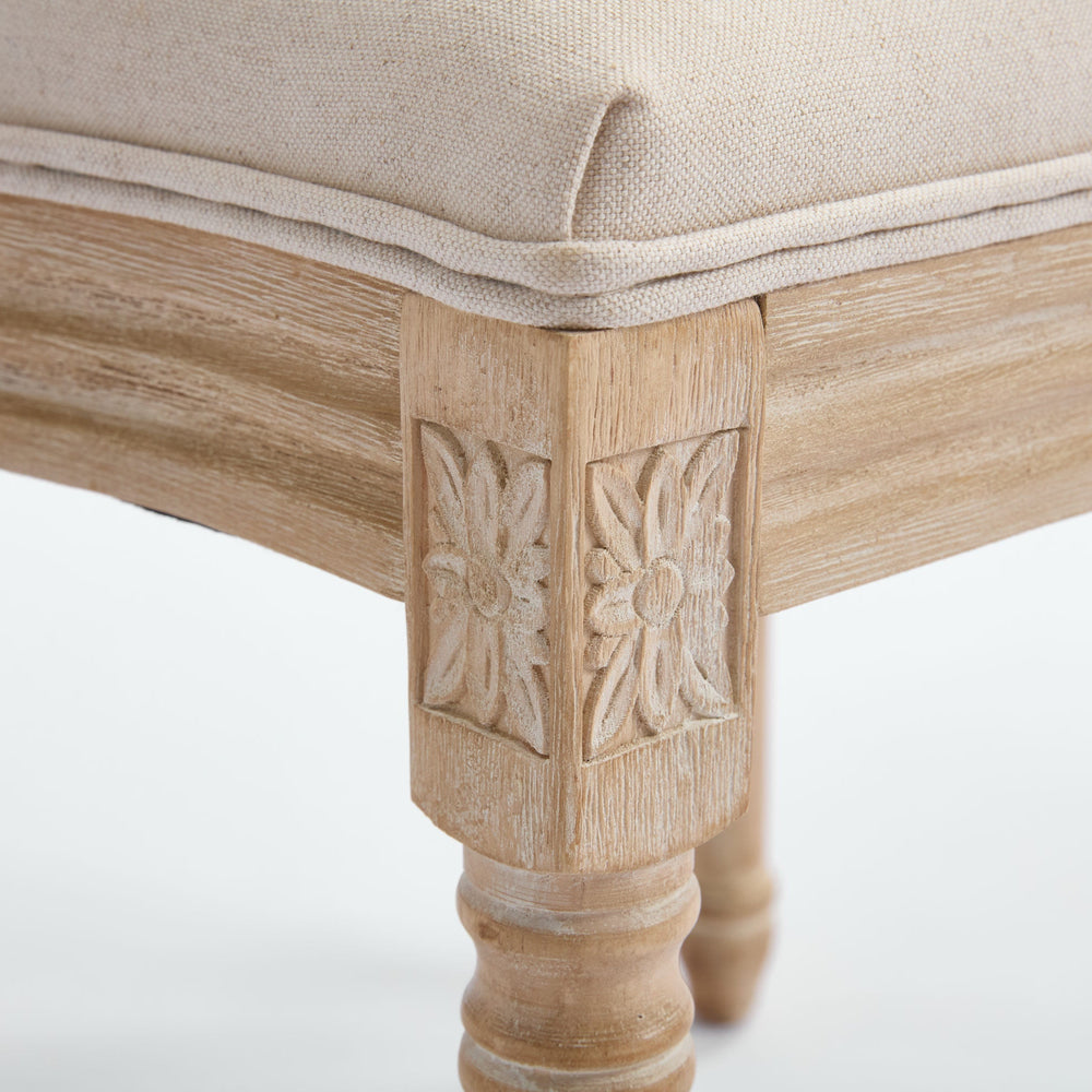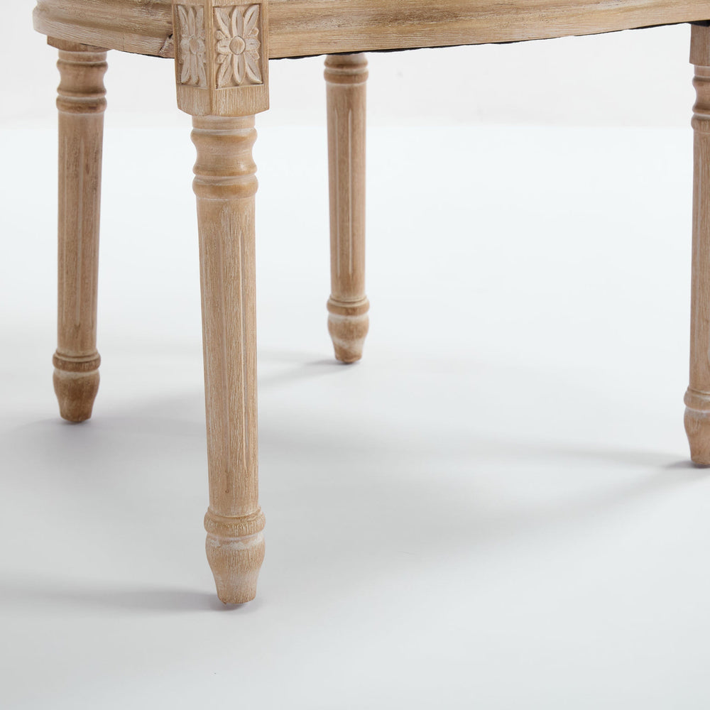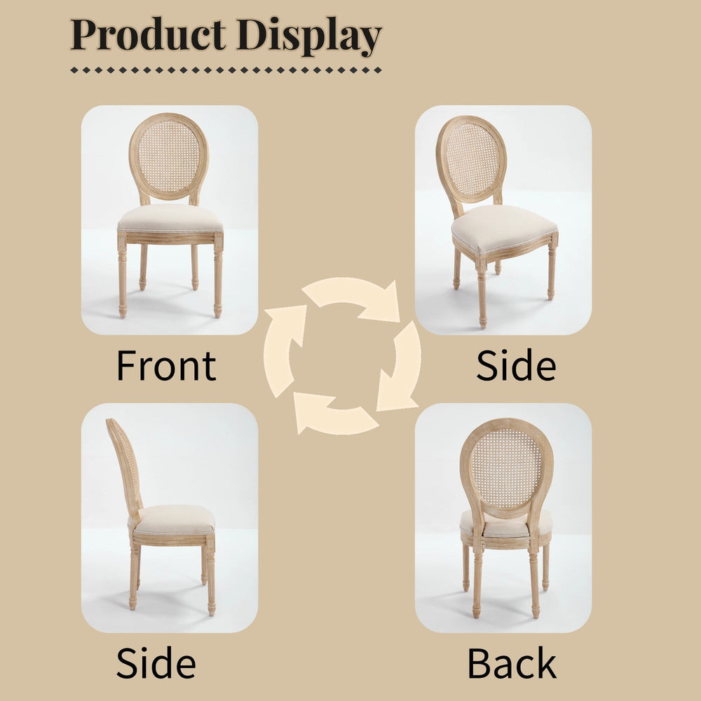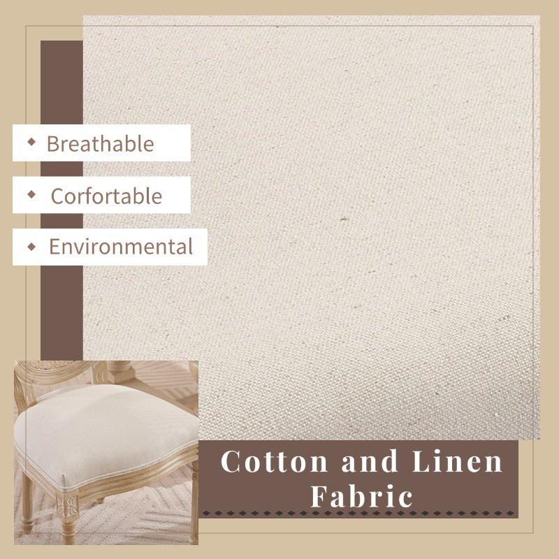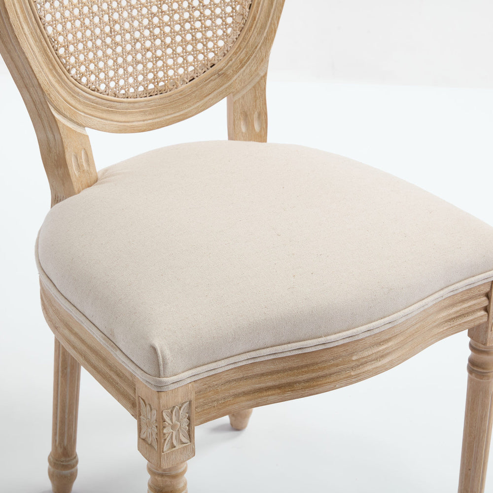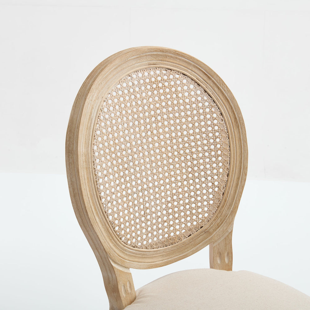 This set of 2 French Country dining chairs features beige cotton linen upholstery and a natural rattan backrest, ideal for enhancing dining rooms, kitchens, or restaurant seating with a classic and comfortable style.