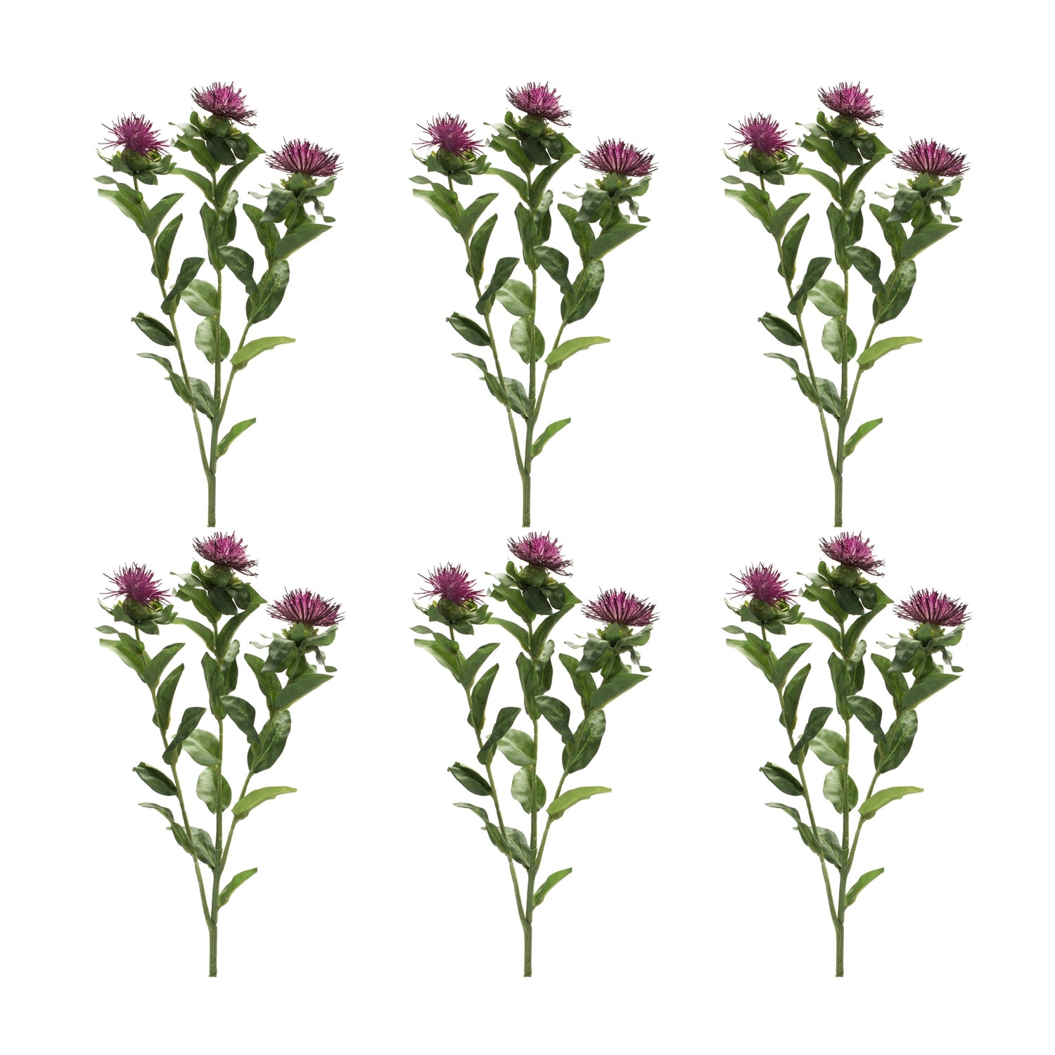 Add a pop of natural color to your home with this beautiful Thistle Spray. Featuring 6 pieces, this set's Thistle flowers paired with the assorted foliage accents makes this piece the perfect additon to your home decor. The quality polyester flowers and leaves are sure to last for seasons to come. Display the piece in a vase or decorative container to complete the look.